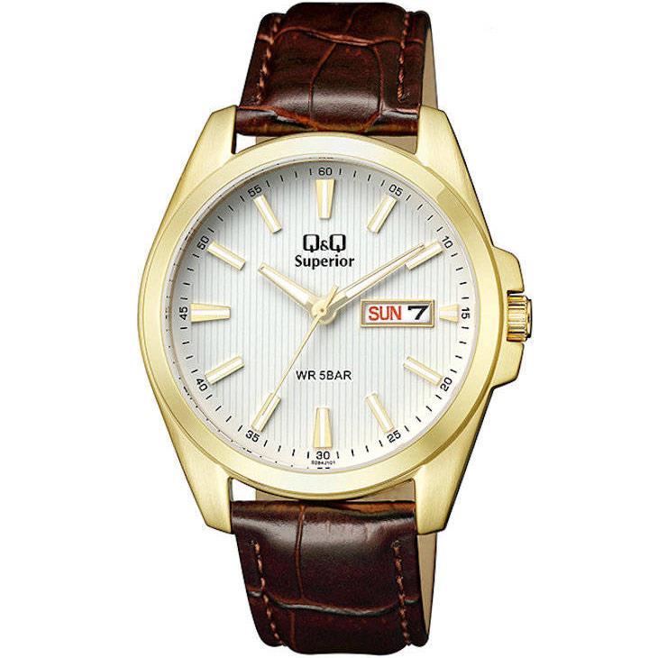ساعت مچی مردانه کیو اند کیو QQ با طراحی روزانه بند چرمی و قاب گرد استیل طلایی و صفحه نقره ای و قابلیت شب نما روزهای هفته تقویم و موتور ژاپنی با انرژی باطری مقاوم در برابر آب تا عمق 50 متر به همراه یک سال گارانتی شرکت
