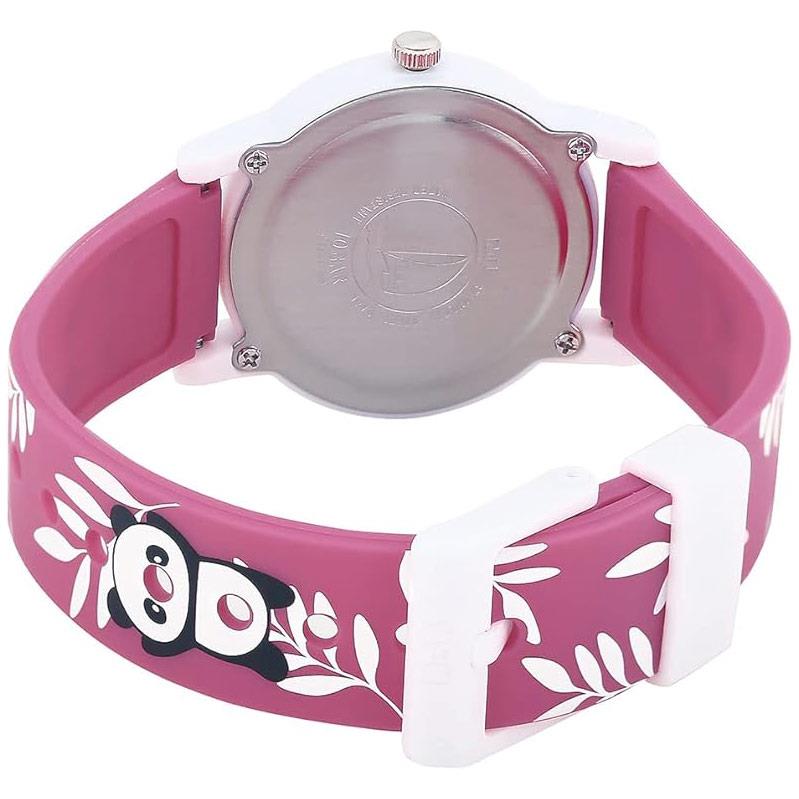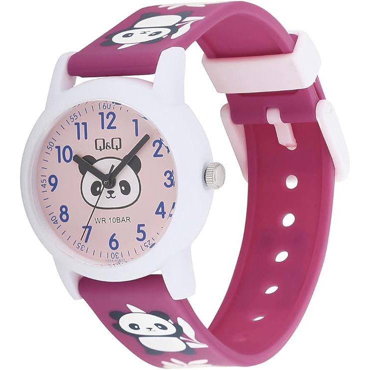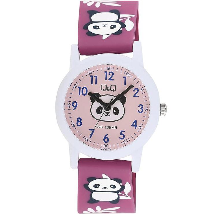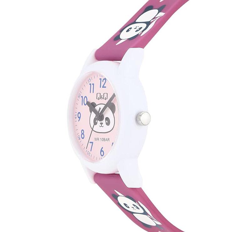 ساعت مچی کودک کیو اند کیو QQ با طراحی روزانه بند سیلیکونی چند رنگ و قاب گرد سفید و صفحه طرحدار صورتی و موتور ژاپنی با انرژی باطری و مقاوم در برابر آب تا عمق 100 متر به همراه گارانتی شرکتی