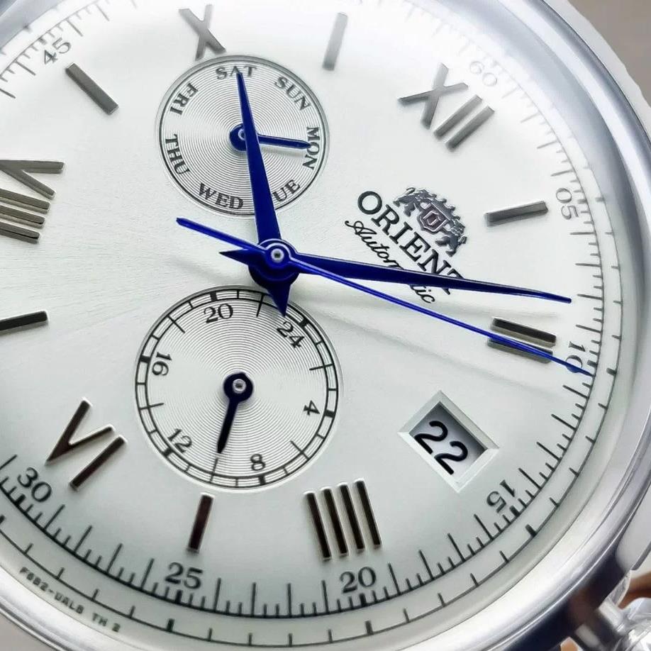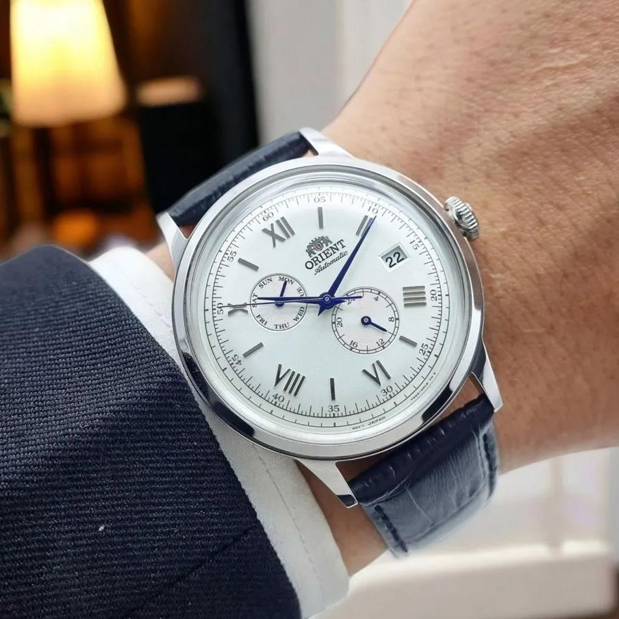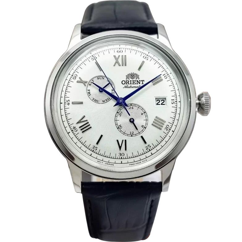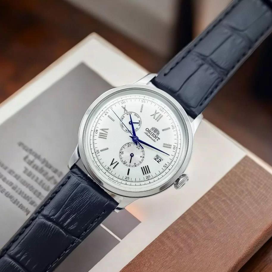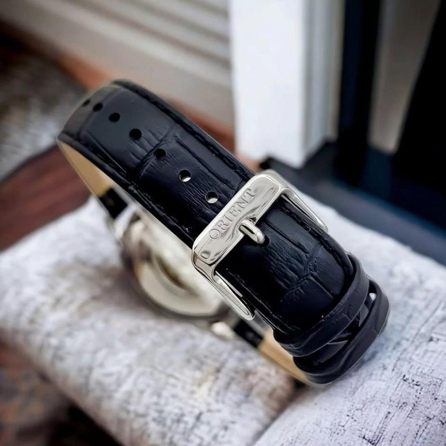 ساعت مچی مردانه اورینت orient با طراحی کلاسیک بند چرمی و قاب استیل و صفحه گرد سفید با قابلیت داشتن تقویم/ روزهای هفته / روزوشب و موتور اتوماتیک ژاپنی با انرژی مکانیکی و مقاومت در برابر آب تا عمق 30 متر به همراه دو سال گارانتی بین المللی