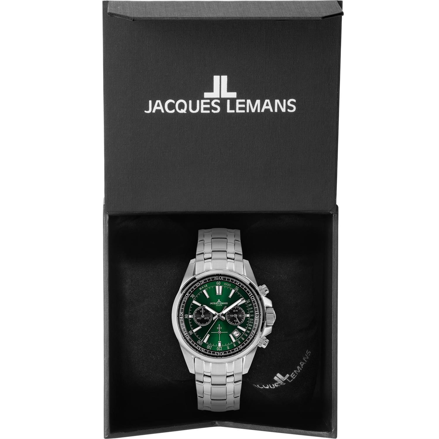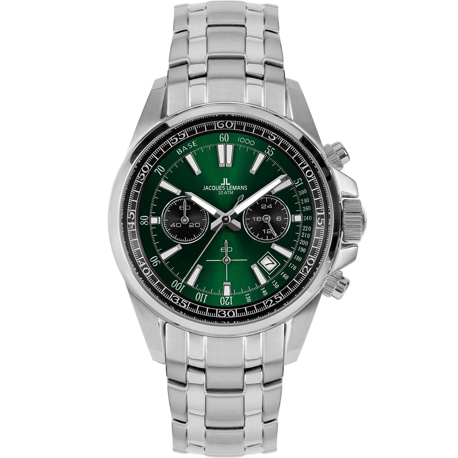 ساعت مچی مردانه ژاک لمن jacques lemans با طراحی روزانه بند استیل و قاب گرد استیل و صفحه گرد سبز با قابلیت داشتن تقویم , شب نما , کرنوگراف , روز و شب , زه تاچی متر با موتور ژاپنی و انرژی باتری و مقاومت در برابر آب تا عمق 200 متر به همراه گارانتی بین المللی