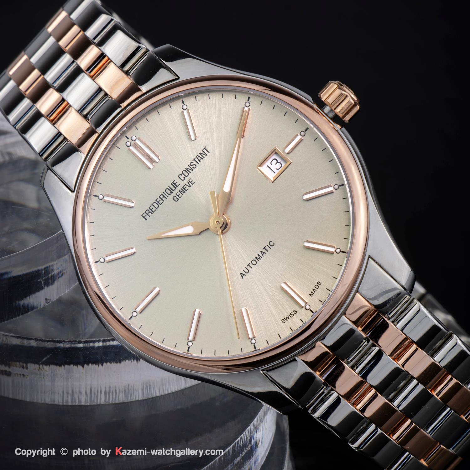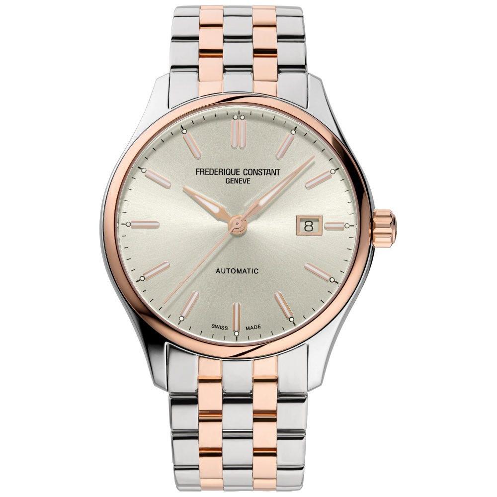 ساعت مچی مردانه FREDERIQUE CONSTANT با طراحی کلاسیک بند استیل مسی با قاب گرد مسی استیل و صفحه گرد بژ با شیشه ضد خراش و قابلیت داشتن تقویم , شب نما و موتور اتوماتیک سوییسی با انرژی مکانیکی و مقاوم در برابر آب تا عمق 50 متر به همراه دو سال گارانتی بین المللی