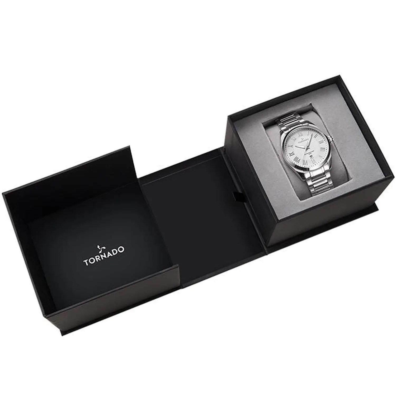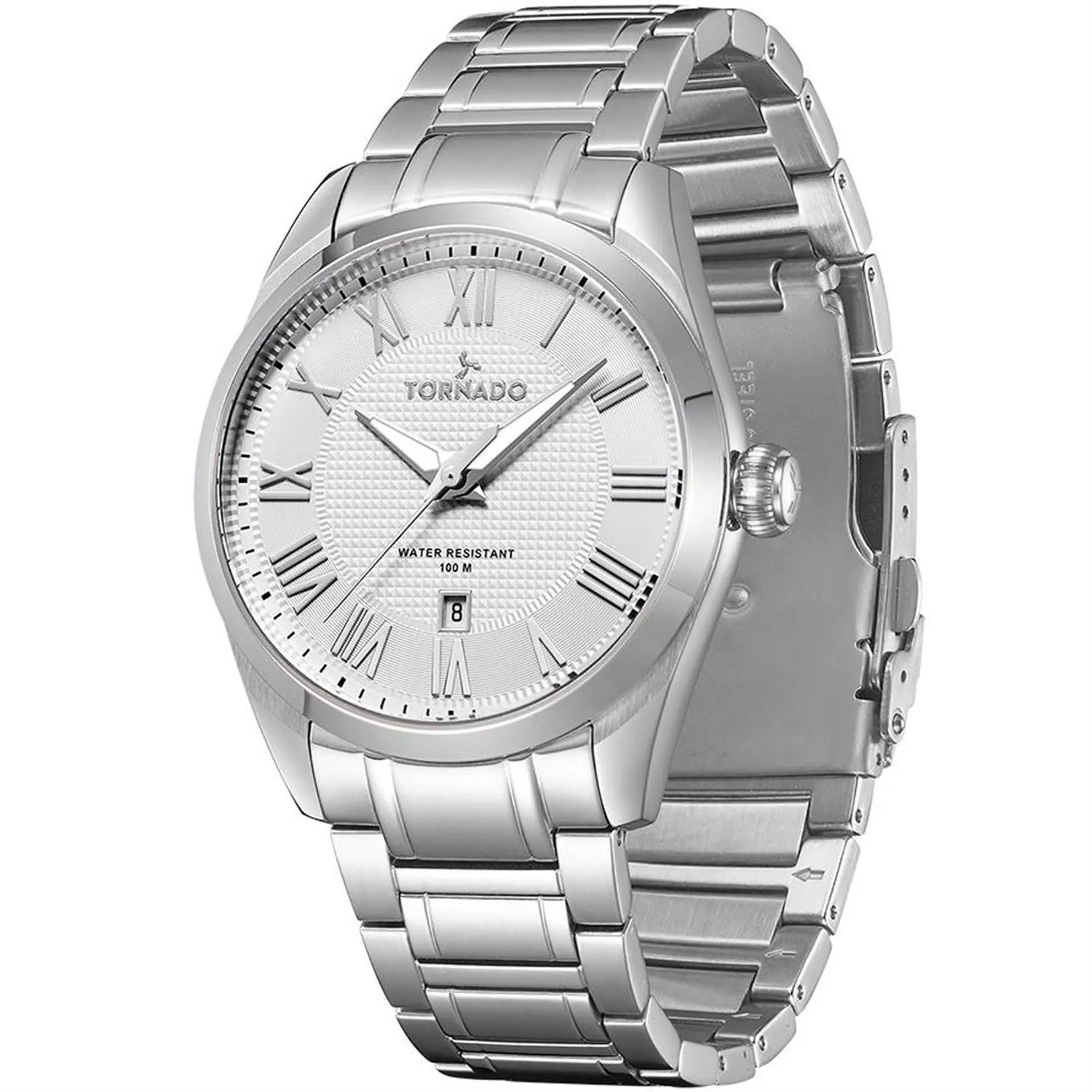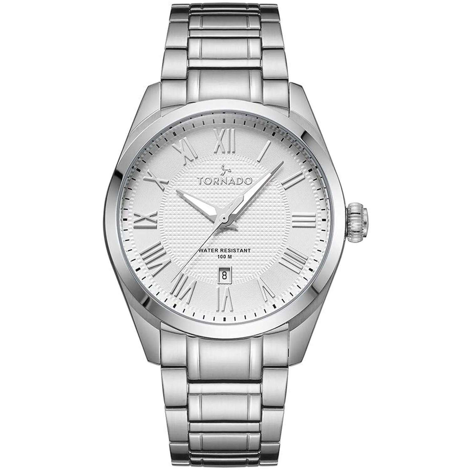 ساعت مچی مردانه تورنادو TORNADO با طراحی اسپرت بند استیل و قاب گرد استیل و صفحه گرد نقره ای و شیشه ضد خراش با موتور ژاپنی با قابلیت تقویم, شب نما و انرژی باطری و مقاوم در برابر آب تا عمق 100 متر به همراه دو سال گارانتی بین المللی