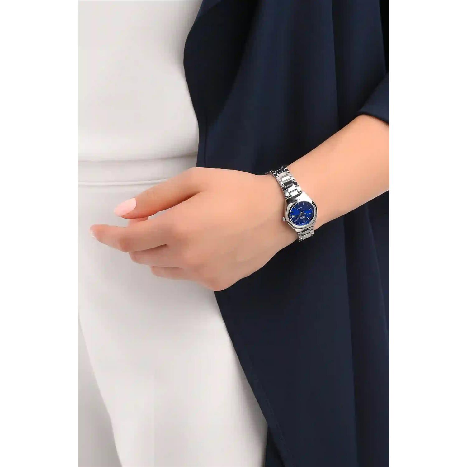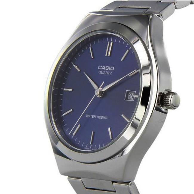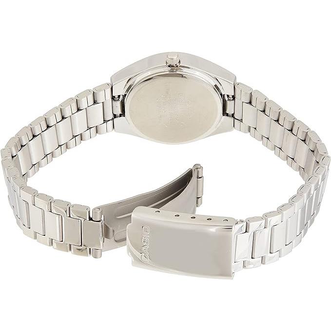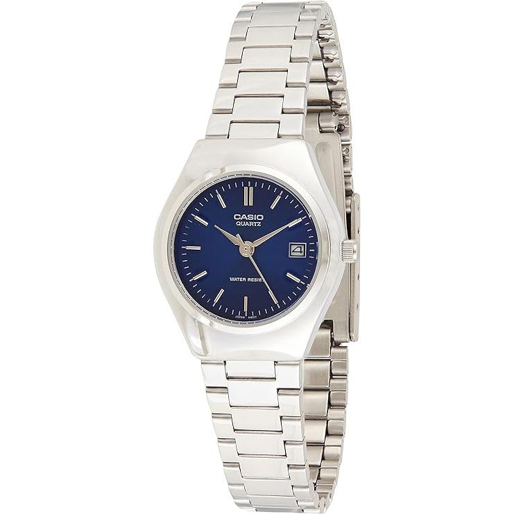 ساعت مچی زنانه کاسیو casio با طراحی روزانه بند استیل با قاب فلزی و صفحه گرد سرمه ای با قابلیت داشتن تقویم و موتور ژاپنی با انرژی باتری و مقاوم در برابر آب تا عمق 30 متر به همراه دو سال گارانتی بین المللی