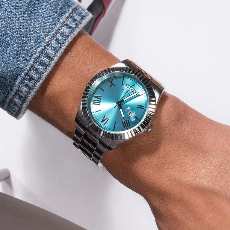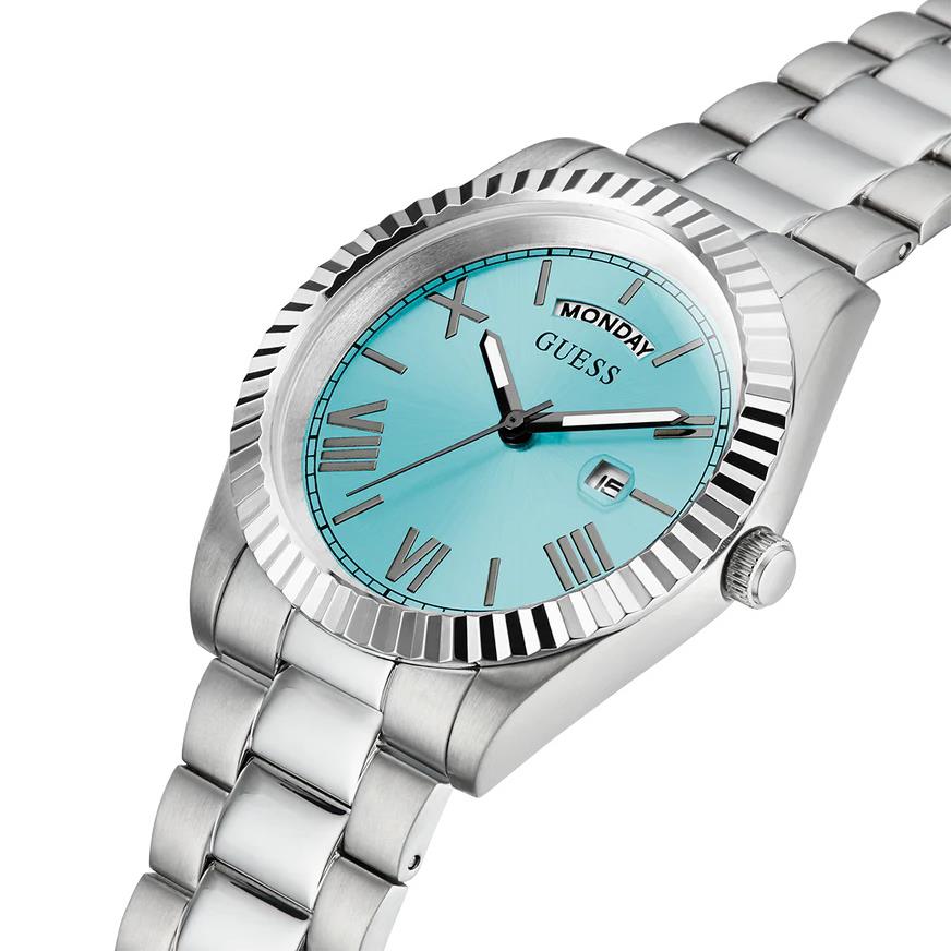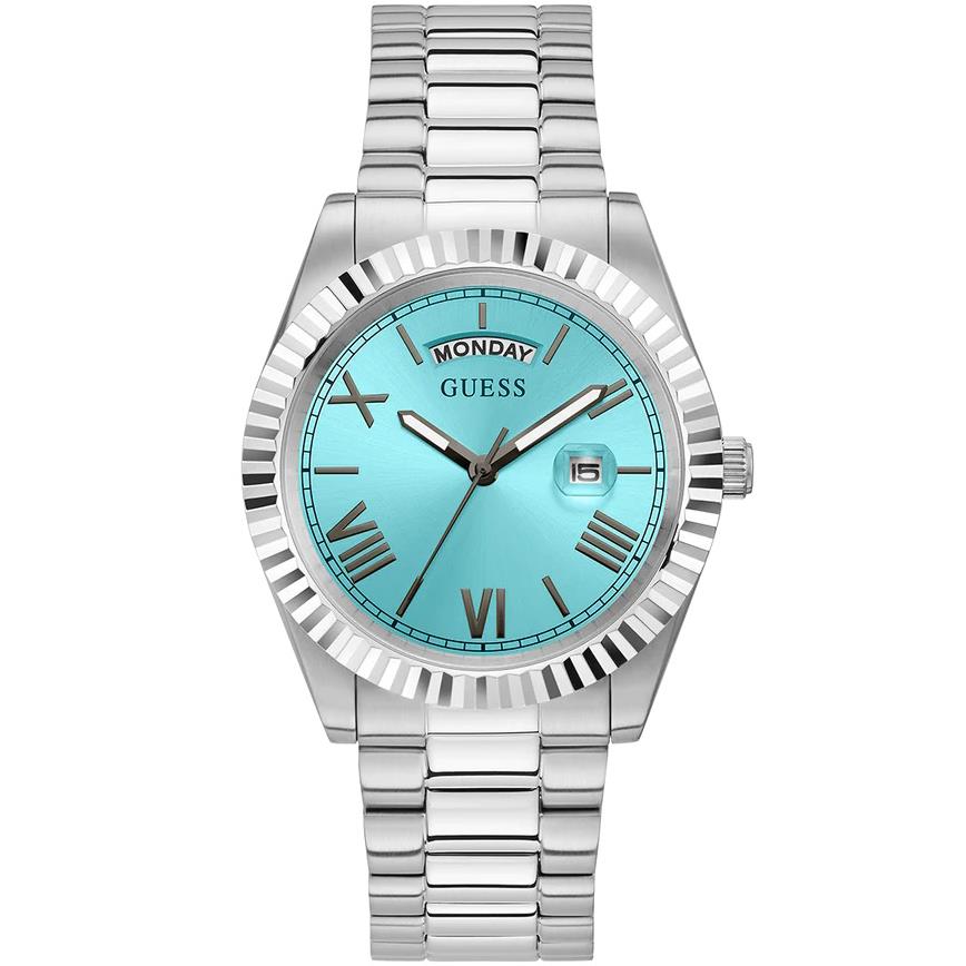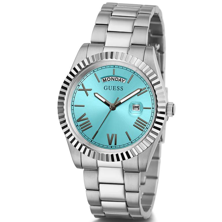 ساعت مچی مردانه گس GUESS با طراحی روزانه بند استیل و قاب استیل و صفحه گرد آبی و موتور ژاپنی با انرژی باتری با قابلیت داشتن شب نما روزهای هفته تقویم و مقاومت در برابر آب تا عمق 50 متر به همراه دو سال گارانتی بین المللی
