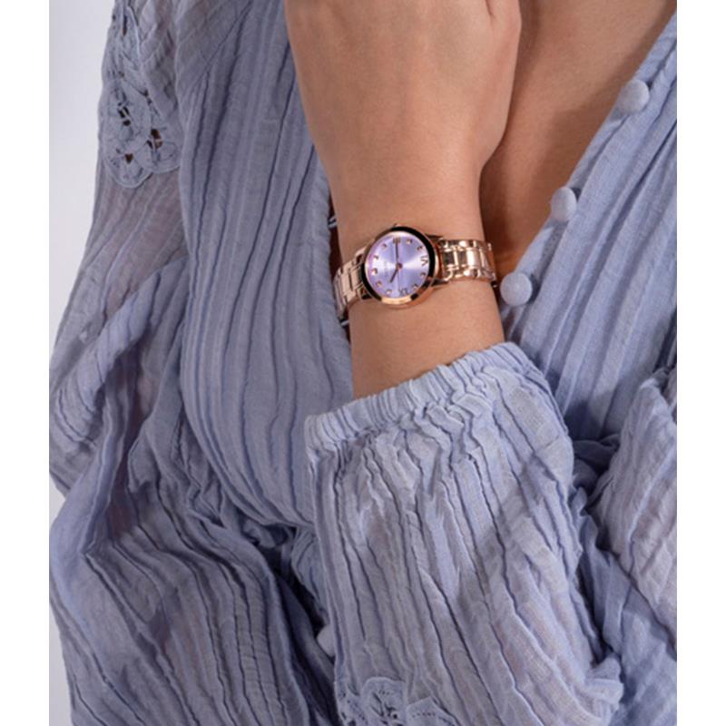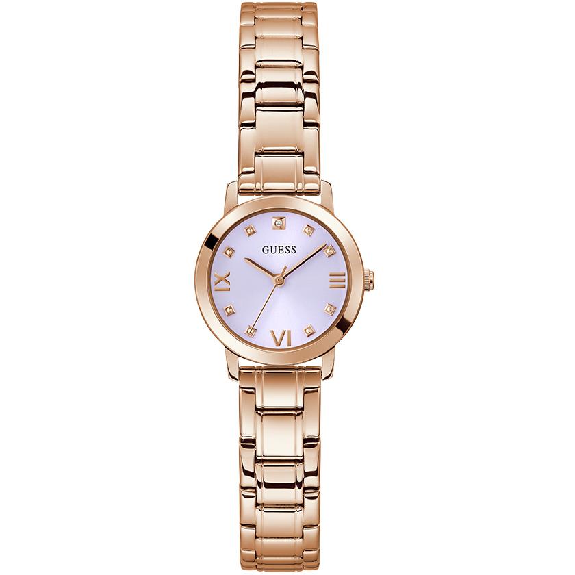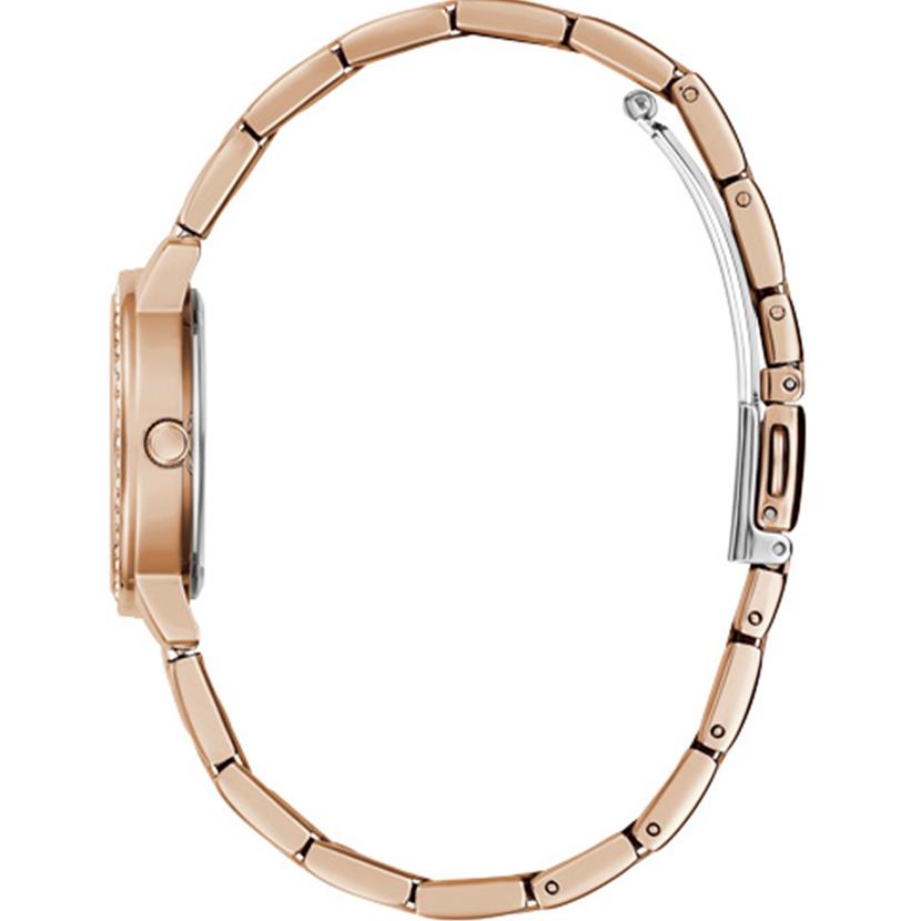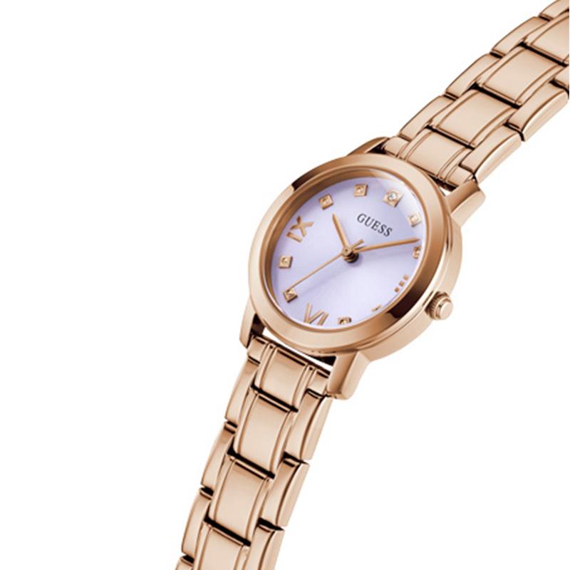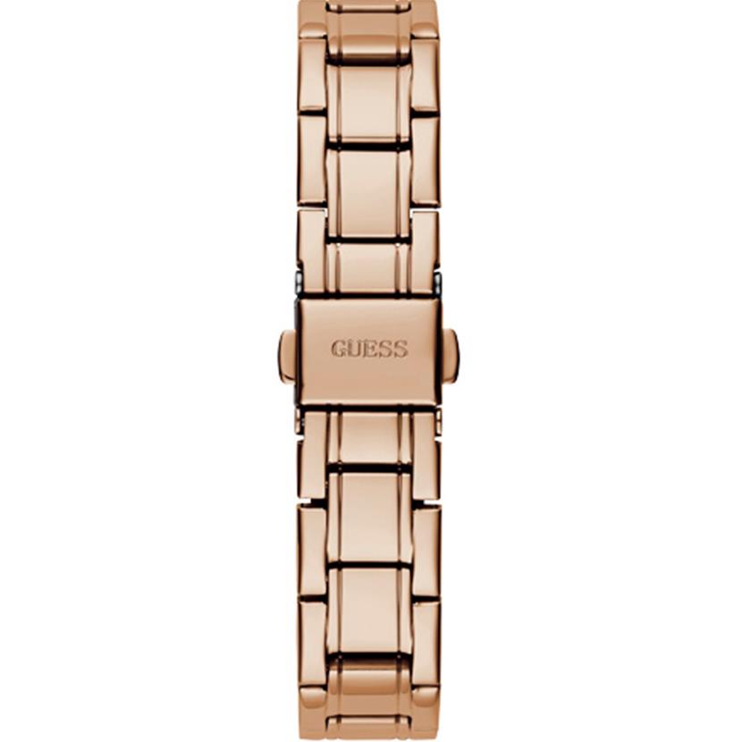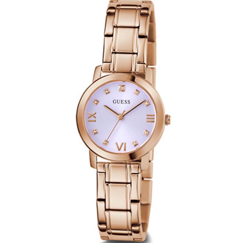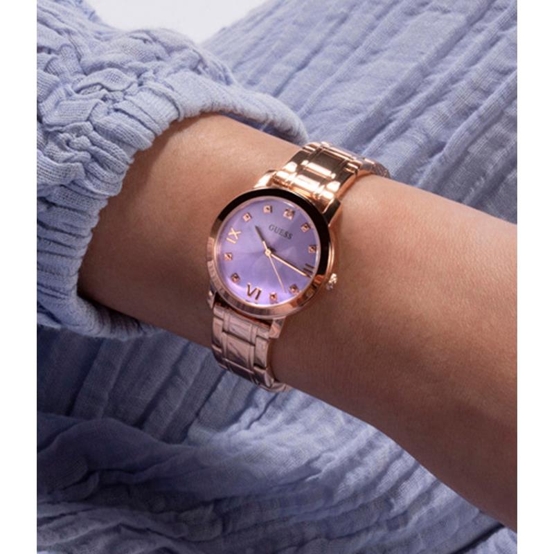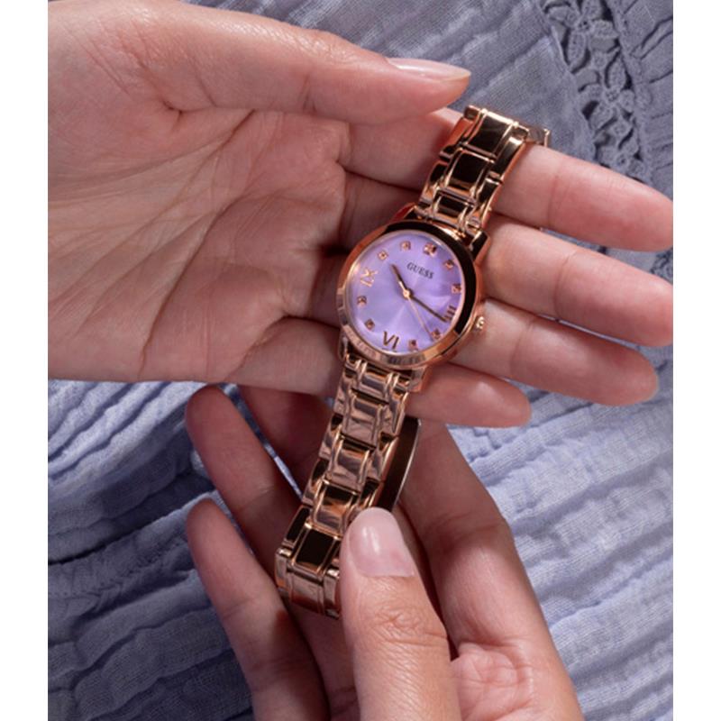 ساعت مچی زنانه گس GUESS با طراحی روزانه بند فلزی مسی و قاب فلزی مسی و صفحه نگین دار بنفش و موتور ژاپنی با انرژی باتری و مقاومت در برابر آب تا عمق 30 متر به همراه دو سال گارانتی بین المللی