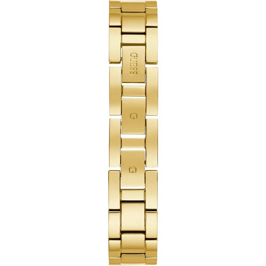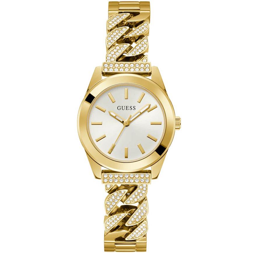 ساعت مچی زنانه گس GUESS با طراحی روزانه بند نگین دار طلایی و قاب فلزی طلایی و صفحه نقره ای با قابلیت داشتن شب نما و موتور ژاپنی با انرژی باتری و مقاومت در برابر آب تا عمق 30 متر به همراه دو سال گارانتی بین المللی