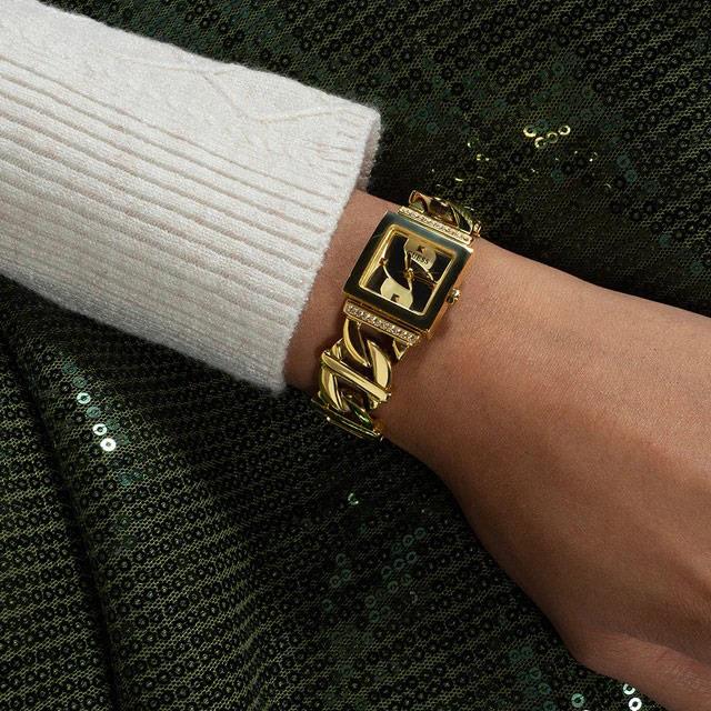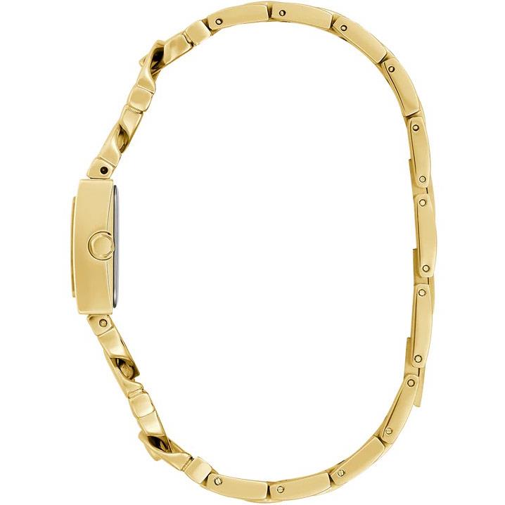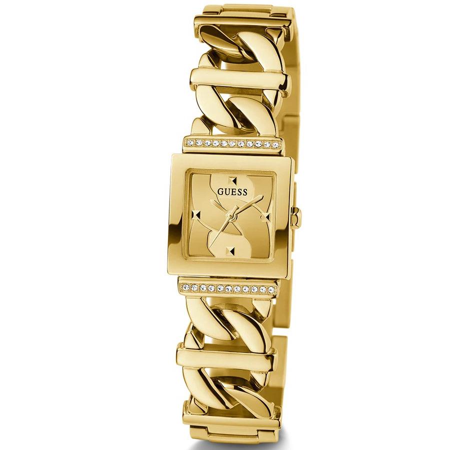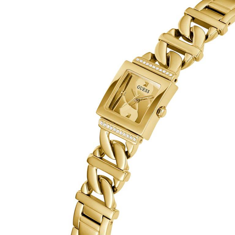 ساعت مچی زنانه گس GUESS با طراحی روزانه بند فلزی طلایی و قاب نگین دار طلایی و صفحه مربع طلایی و موتور ژاپنی با انرژی باتری  ومقاوم در برابر آب تا عمق 30 متر به همراه دو سال گارانتی بین المللی
