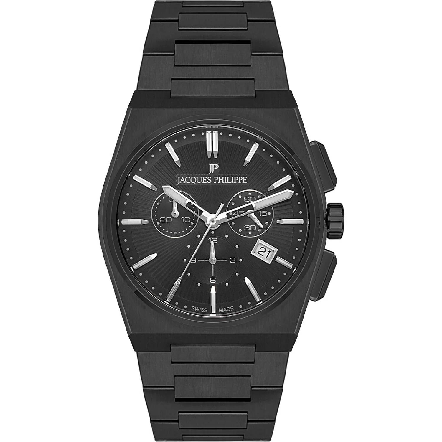 ساعت مچی مردانه ژاک فیلیپ jacques philippe با طراحی کلاسیک بند فلزی مشکی و قاب فلزی مشکی و صفحه گرد مشکی با شیشه ضد خراش و قابلیت داشتن تقویم / شب نما/ کرنوگراف با موتور سوییسی و انرژی باتری و مقاوم در برابر آب تا عمق 50 متر به همراه گارانتی بین المللی