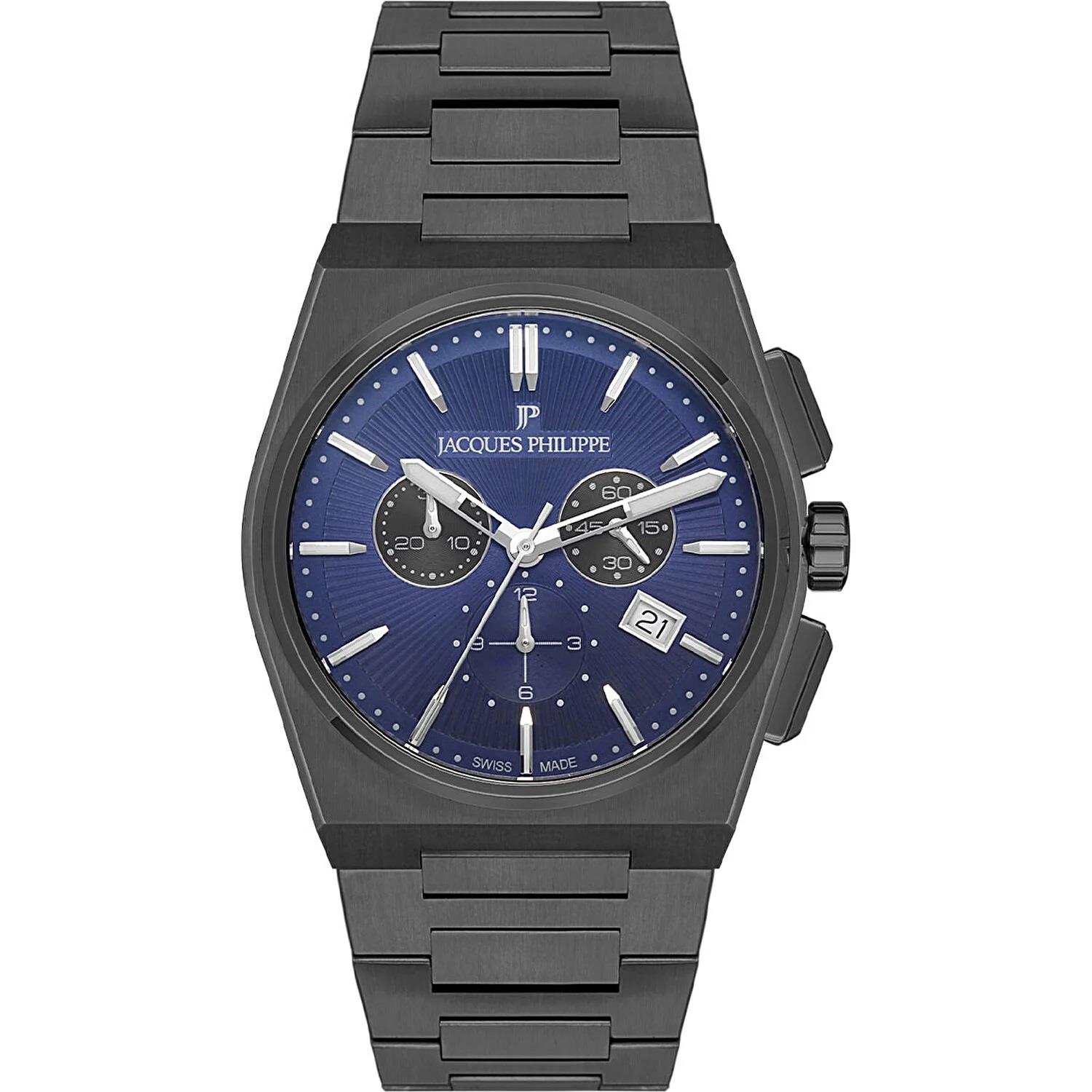 ساعت مچی مردانه ژاک فیلیپ jacques philippe با طراحی کلاسیک بند فلزی مشکی و قاب فلزی مشکی و صفحه گرد سرمه ای با شیشه ضد خراش و قابلیت داشتن تقویم / شب نما/ کرنوگراف با موتور سوییسی و انرژی باتری و مقاوم در برابر آب تا عمق 50 متر به همراه گارانتی بین المللی