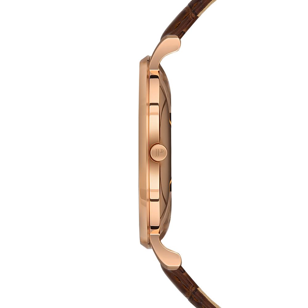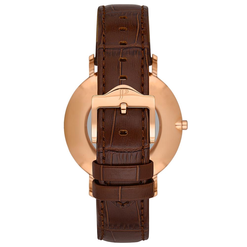 ساعت مچی مردانه ژاک فیلیپ jacques philippe با طراحی کلاسیک بند چرمی قهوه ای و قاب فلزی مسی و صفحه گرد طوسی با شیشه ضد خراش و موتور سوییسی و انرژی باتری و مقاوم در برابر آب تا عمق 30 متر به همراه گارانتی بین المللی