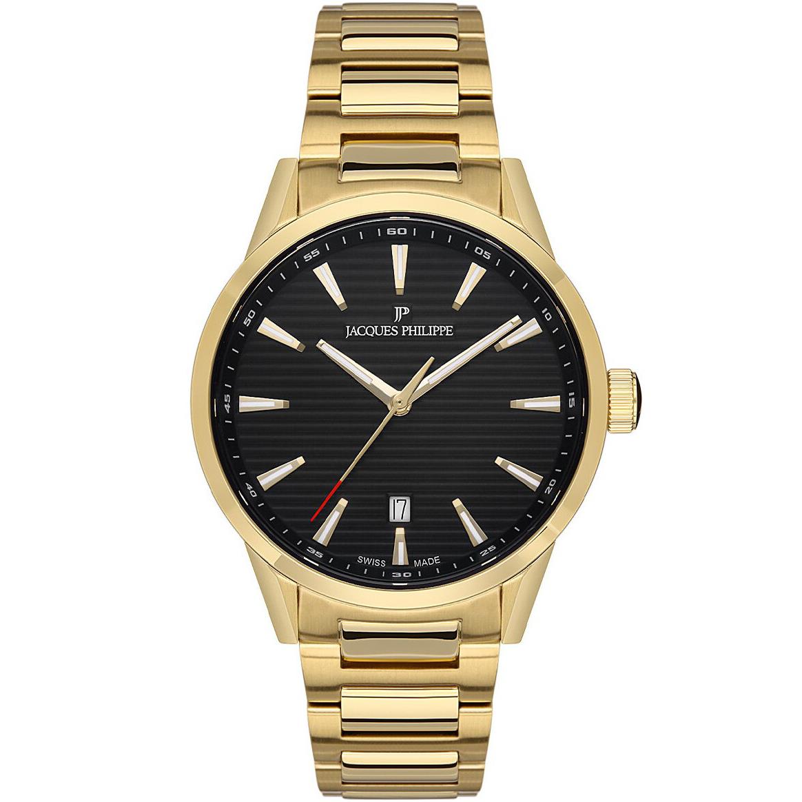 ساعت مچی مردانه ژاک فیلیپ jacques philippe با طراحی کلاسیک بند فلزی طلایی و قاب فلزی طلایی و صفحه گرد مشکی با شیشه ضد خراش و قابلیت داشتن تقویم / شب نما با موتور سوییسی و انرژی باتری و مقاوم در برابر آب تا عمق 50 متر به همراه گارانتی بین المللی