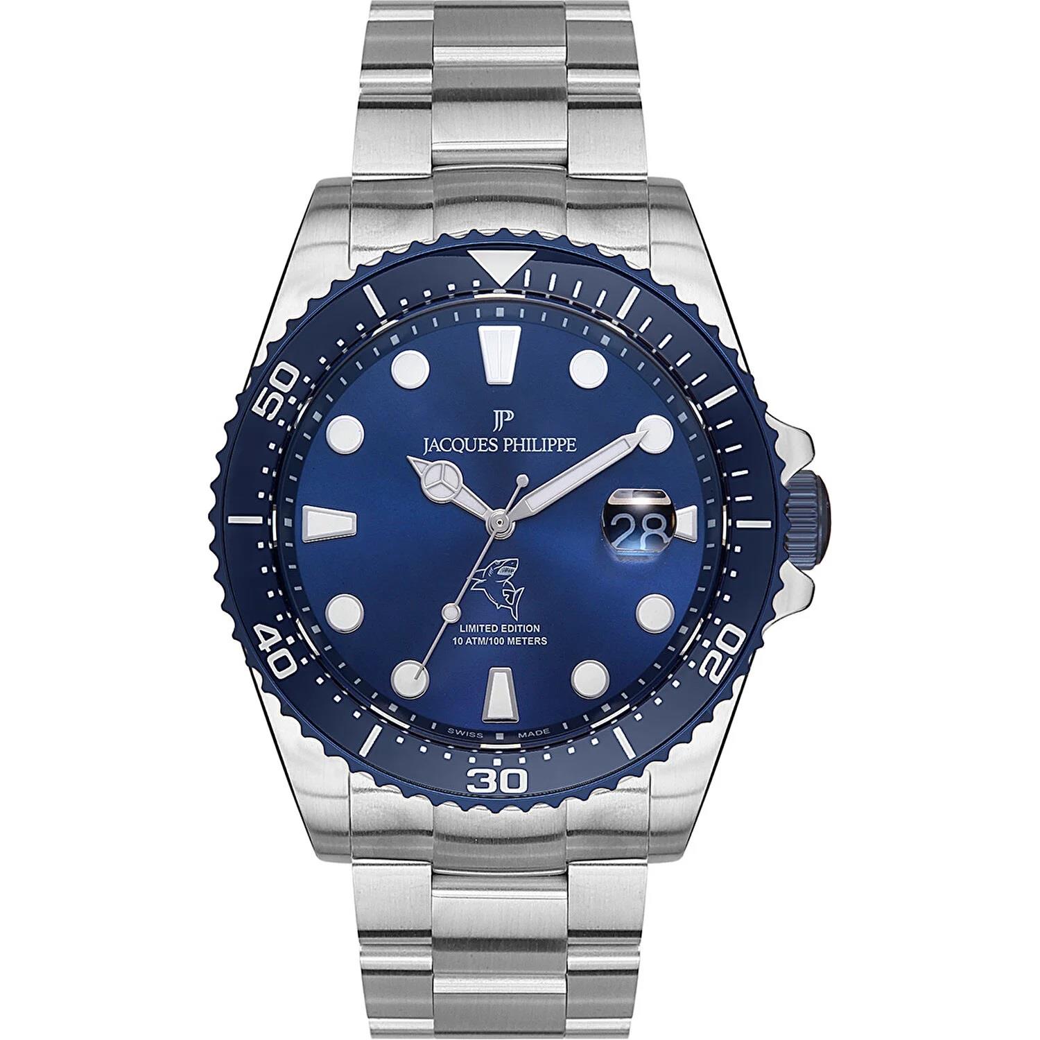 ساعت مچی مردانه ژاک فیلیپ jacques philippe با طراحی کلاسیک بند استیل و قاب گرد استیل سرمه ای و صفحه گرد سرمه ای با شیشه ضد خراش و قابلیت داشتن تقویم / شب نما / زه چرخان با موتور سوییسی و انرژی باتری و مقاوم در برابر آب تا عمق 100 متر به همراه گارانتی بین المللی