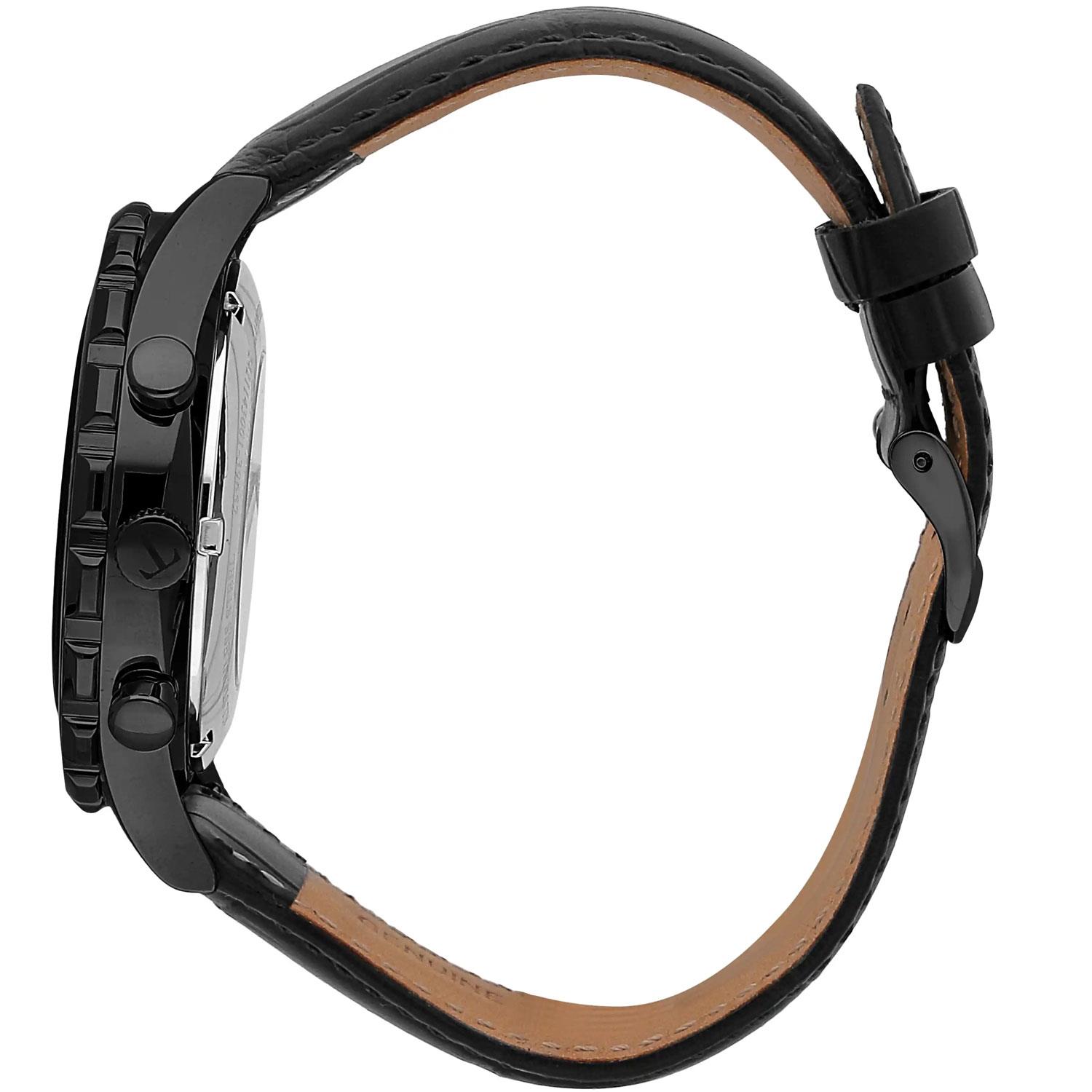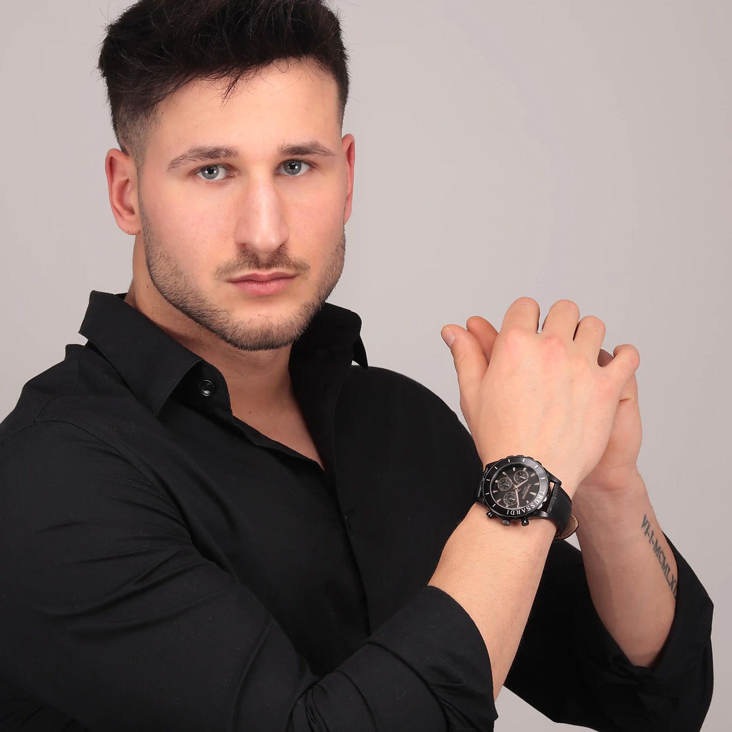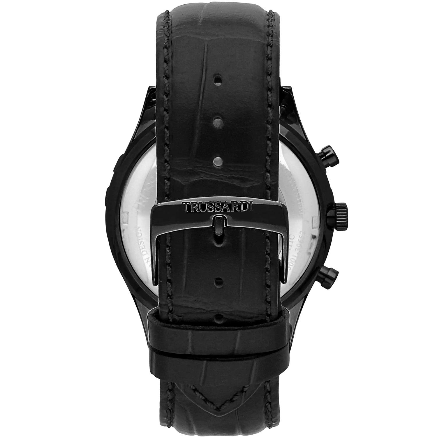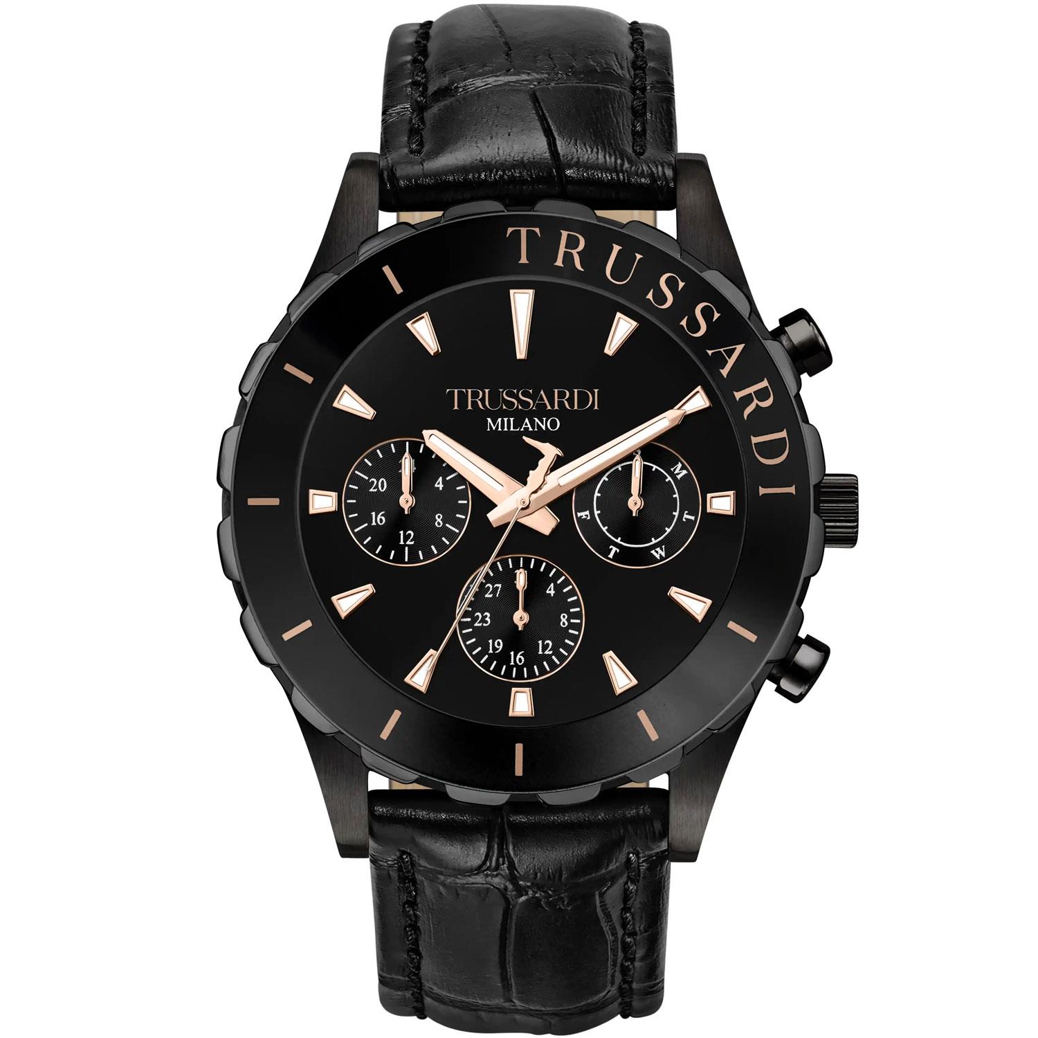 ساعت مچی مردانه  Trussardi تروساردی با طراحی کلاسیک بند چرمی و قاب فلزی مشکی و صفحه گرد مشکی با قابلیت داشتن تقویم روز و ماه / شب نما و موتور ژاپنی با انرژی باتری و مقاومت در برابر آب تا عمق 50 متر به همراه گارانتی بین المللی