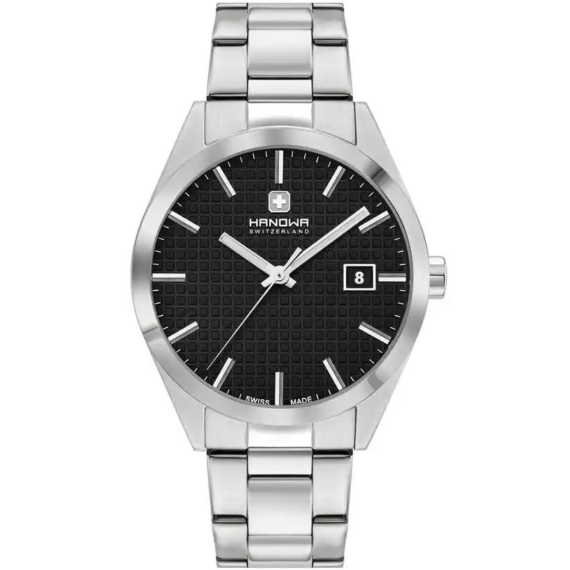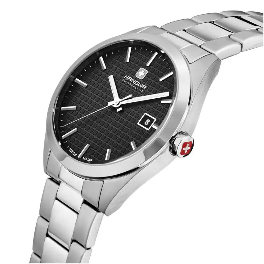 ساعت مچی مردانه هانوا HANOWA با طراحی کلاسیک بند استیل با قاب استیل و صفحه گرد مشکی با قابلیت داشتن تقویم / شب نما و موتور سوییسی با انرژی باطری و مقاوم در برابر آب تا عمق 50 متر به همراه دو سال گارانتی بین المللی