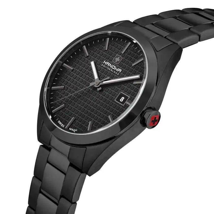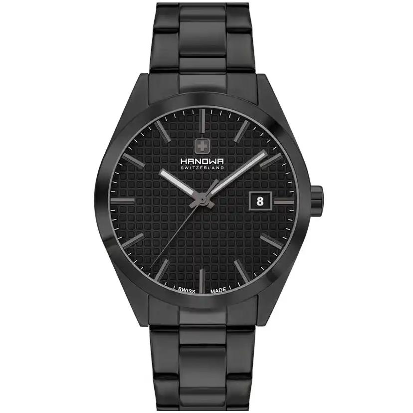ساعت مچی مردانه هانوا HANOWA با طراحی کلاسیک بند فلزی مشکی با قاب فلزی مشکی و صفحه گرد مشکی با قابلیت داشتن تقویم / شب نما و موتور سوییسی با انرژی باطری و مقاوم در برابر آب تا عمق 50 متر به همراه دو سال گارانتی بین المللی