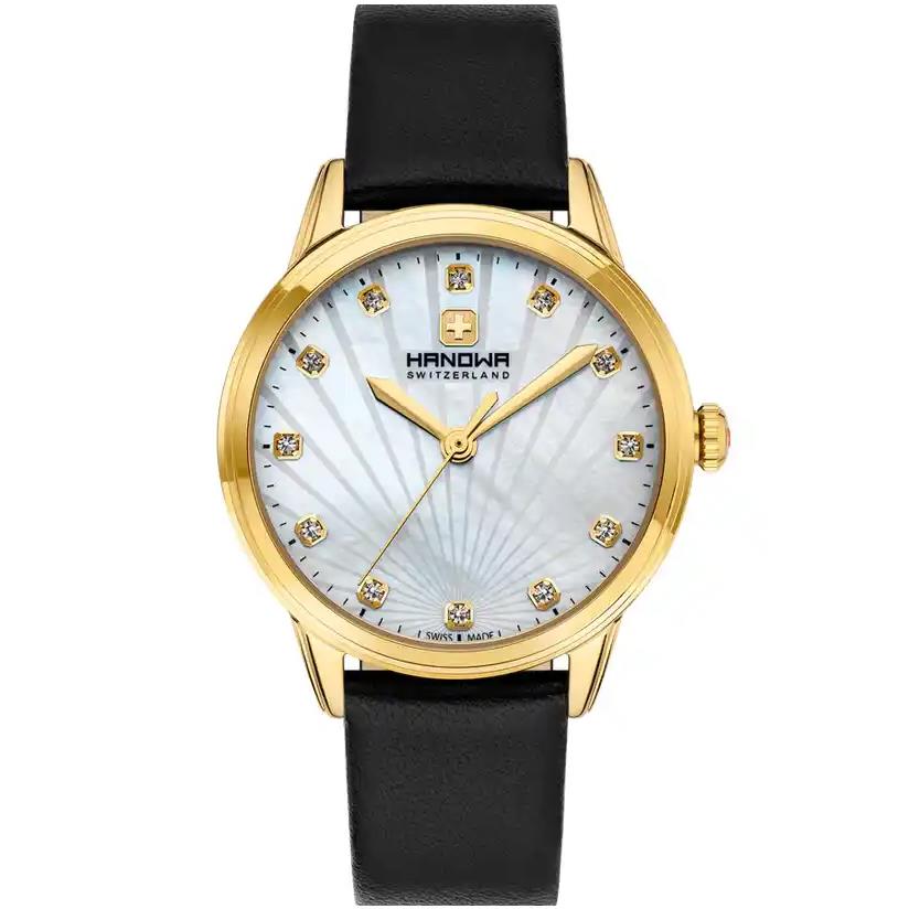 ساعت مچی زنانه هانوا HANOWA با طراحی کلاسیک بند چرمی با قاب فلزی طلایی و صفحه نگین دار سفید صدفی با موتور سوییسی و انرژی باتری و مقاوم در برابر آب تا عمق 50 متر به همراه دو سال گارانتی بین المللی