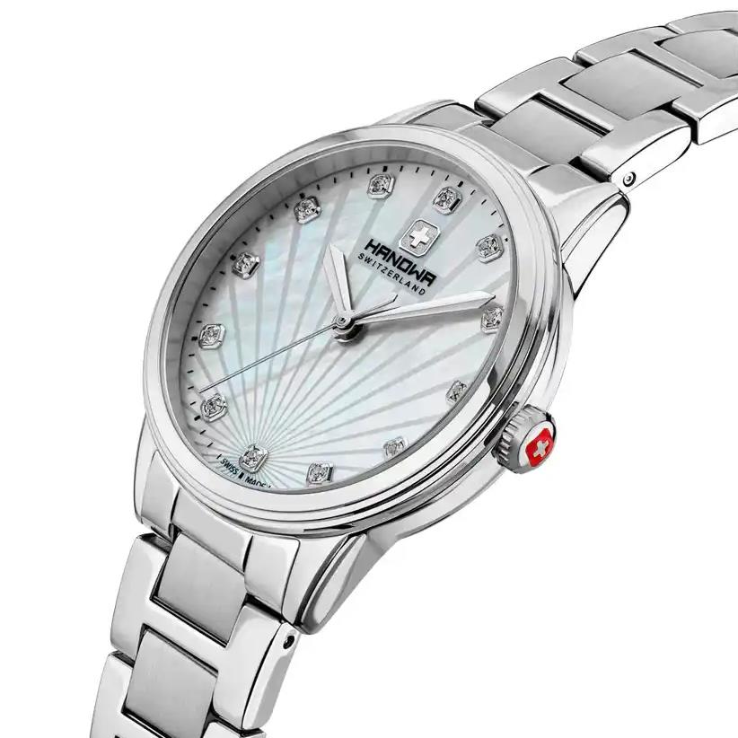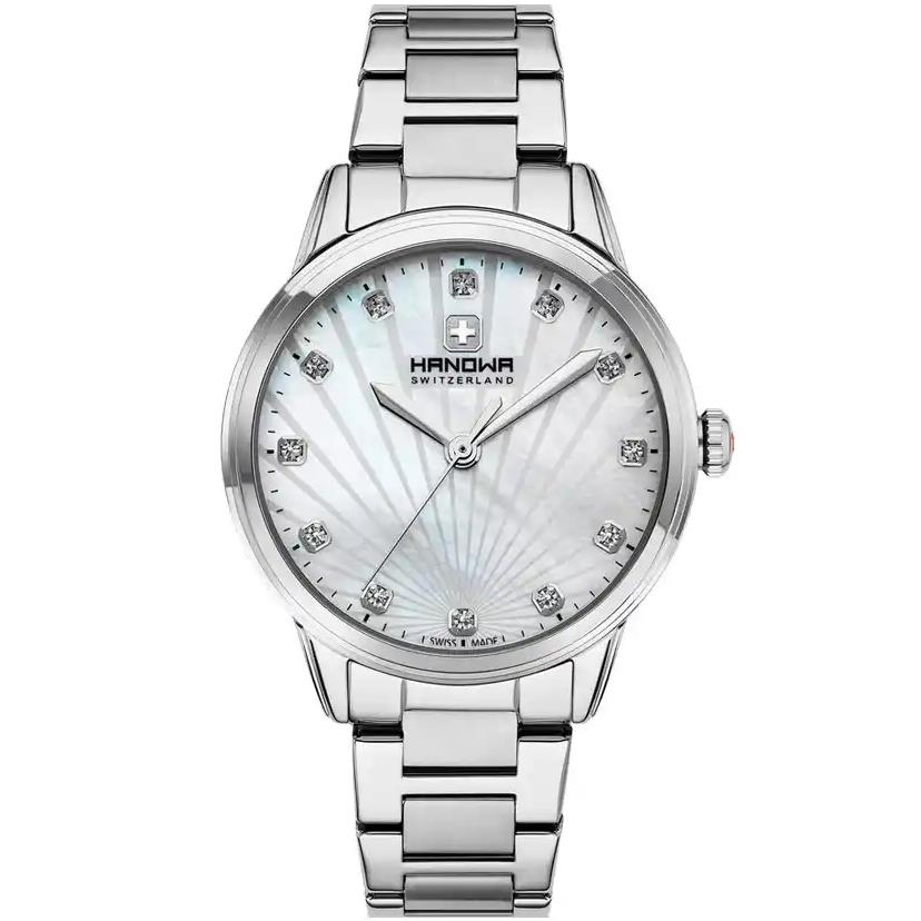 ساعت مچی زنانه هانوا HANOWA با طراحی کلاسیک بند استیل با قاب استیل و صفحه گرد سفید صدفی با قابلیت داشتن تقویم / شب نما موتور سوییسی و انرژی باتری و مقاوم در برابر آب تا عمق 50 متر به همراه دو سال گارانتی بین المللی