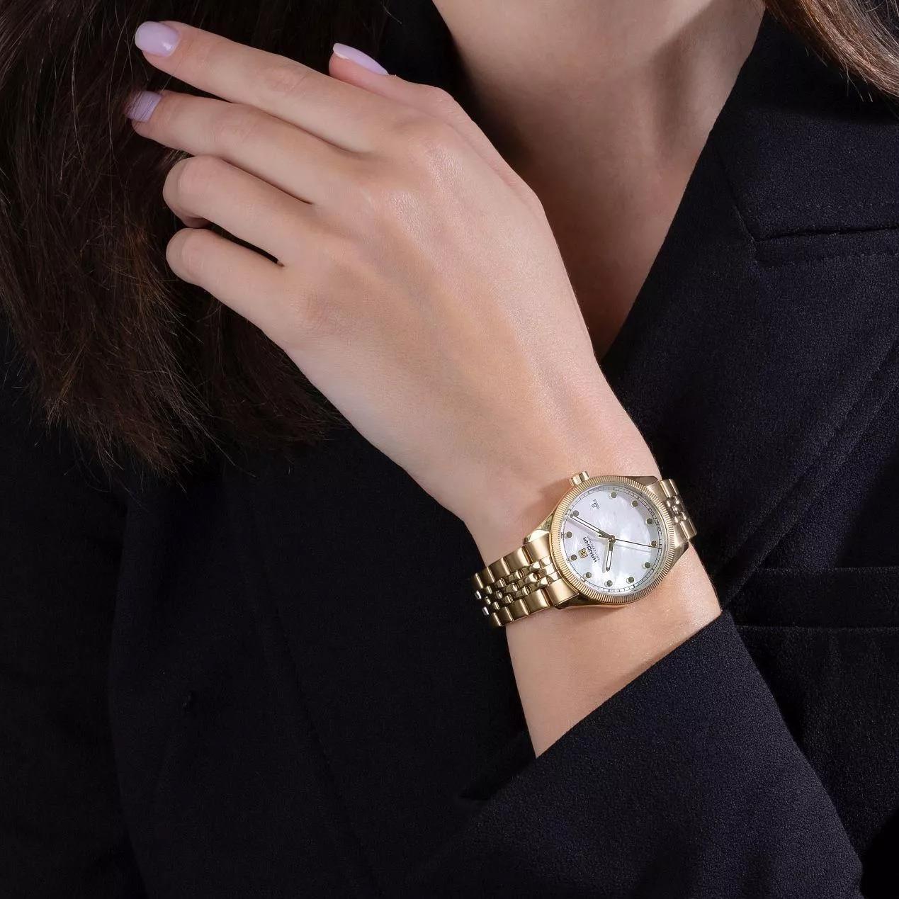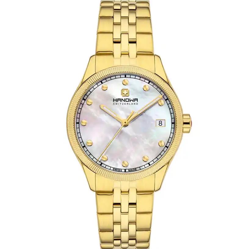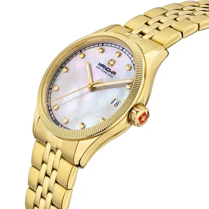 ساعت مچی زنانه هانوا HANOWA با طراحی کلاسیک بند فلزی طلایی با قاب فلزی طلایی و صفحه گرد سفید صدفی با قابلیت داشتن تقویم / شب نما موتور سوییسی و انرژی باتری و مقاوم در برابر آب تا عمق 50 متر به همراه دو سال گارانتی بین المللی