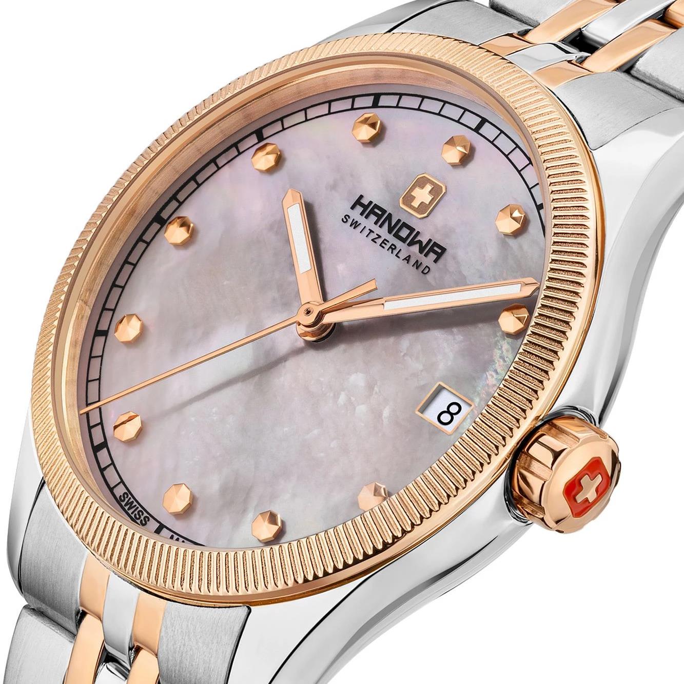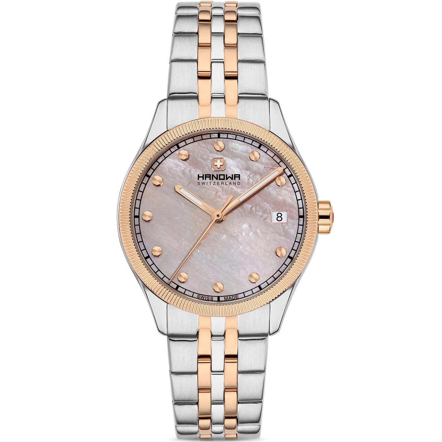 ساعت مچی زنانه هانوا HANOWA با طراحی کلاسیک بند استیل مسی با قاب گرد دورنگ و صفحه گرد صورتی صدفی با قابلیت داشتن تقویم / شب نما موتور سوییسی و انرژی باتری و مقاوم در برابر آب تا عمق 50 متر به همراه دو سال گارانتی بین المللی