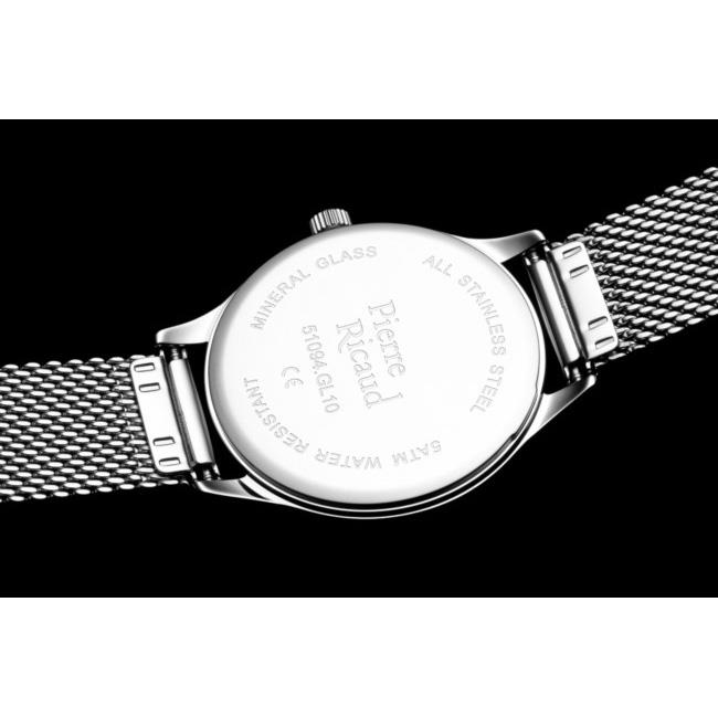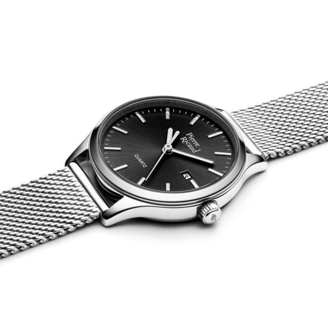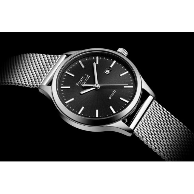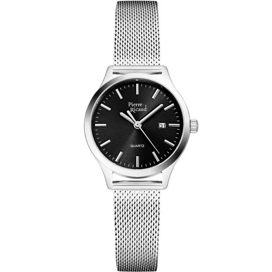 ساعت مچی زنانه pierre ricaud پیر ریکود با طراحی روزانه بند حصیر بافت استیل با قاب گرد استیل و صفحه گرد مشکی و قابلیت داشتن تقویم با موتور ژاپنی با انرژی باتری و مقاوم در برابر آب تا عمق 50 متر به همراه گارانتی بین المللی