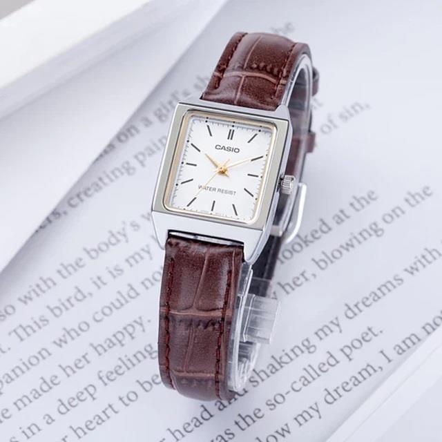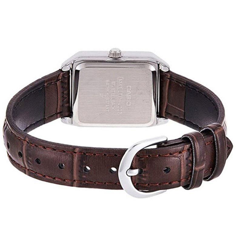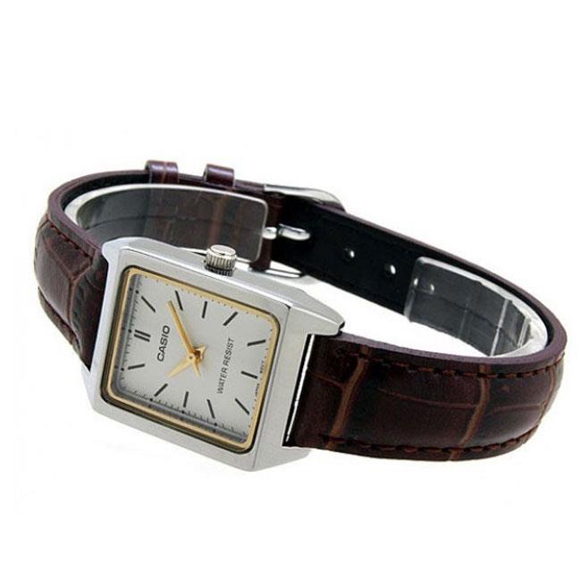 ساعت مچی زنانه کاسیو casio با طراحی روزانه بند چرمی قهوه ای با قاب مستطیل برنج با روکش استیل و صفحه  مستطیل سفید و موتور ژاپنی با انرژی باتری و مقاوم در برابر آب تا عمق 30 متر به همراه دو سال گارانتی بین المللی