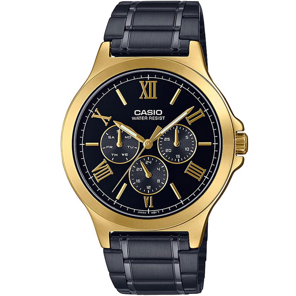 ساعت مچی مردانه کاسیو casio با طراحی اسپرت بند فلزی مشکی با قاب گرد فلزی طلایی و صفحه گرد مشکی و قابلیت داشتن تقویم / شب نما /روز و شب/ روزهای هفته موتور ژاپنی با انرژی باتری و مقاوم در برابر آب تا عمق 30 متر به همراه گارانتی بین المللی
