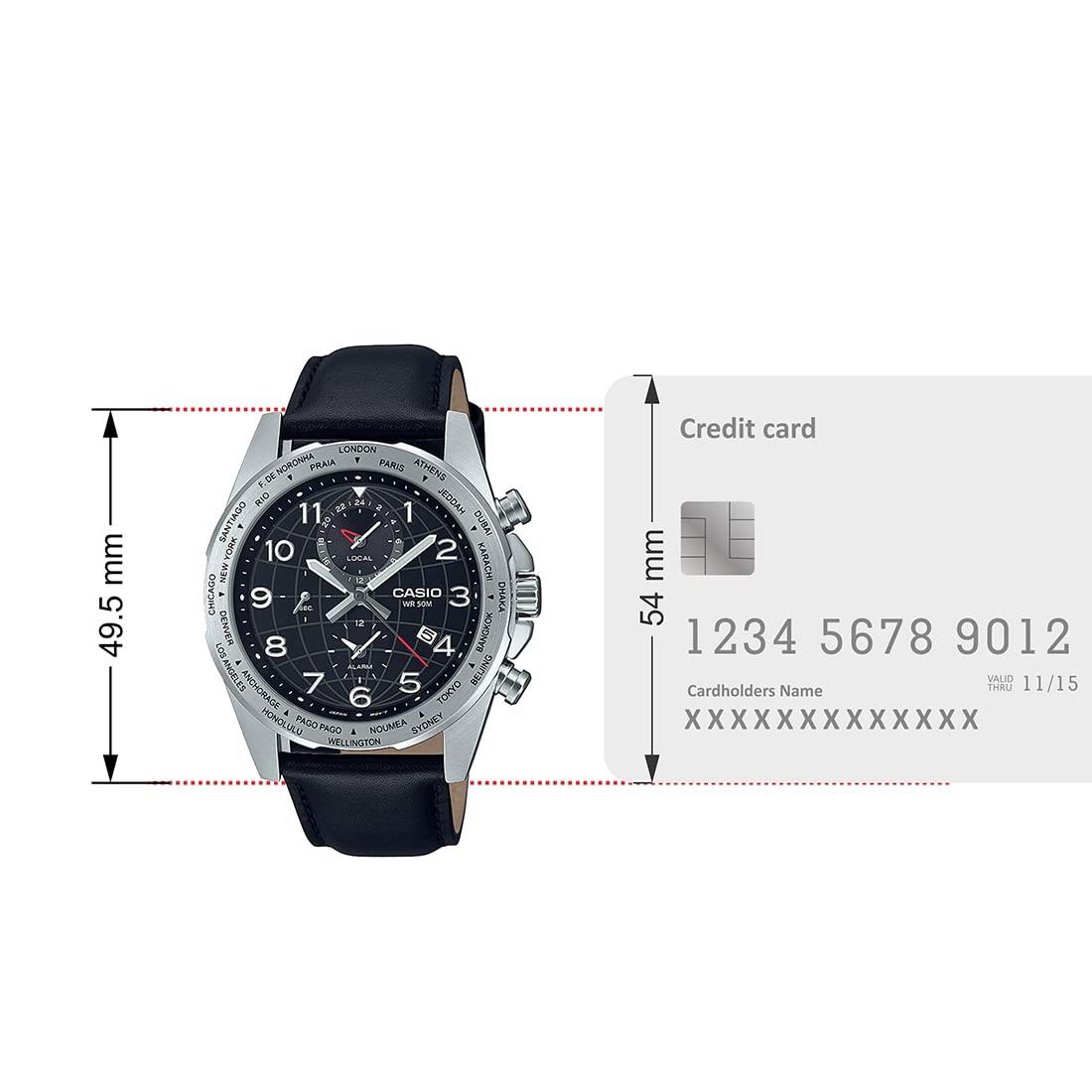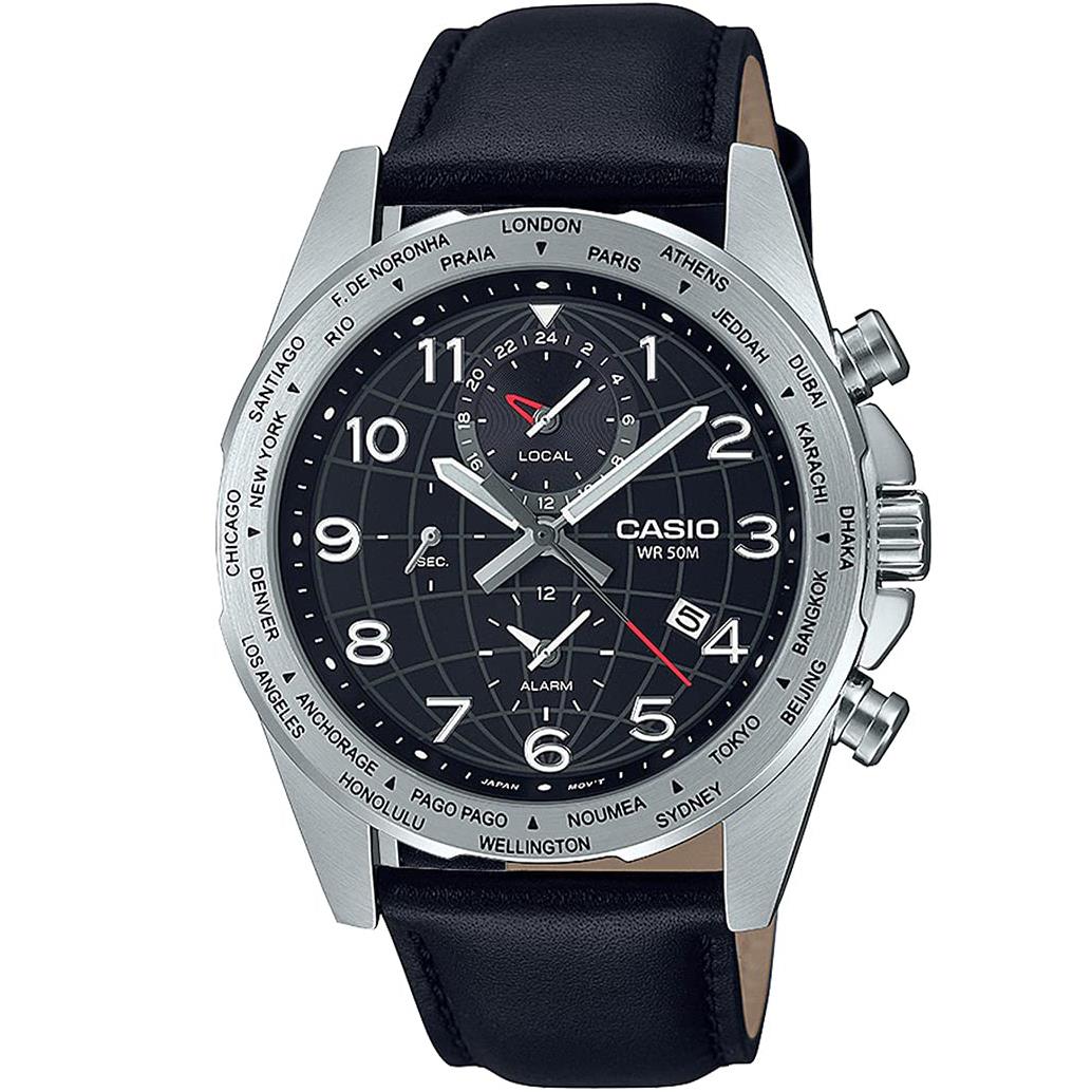 ساعت مچی مردانه کاسیو casio با طراحی اسپرت بند چرمی با قاب گرد استیل و صفحه گرد مشکی و قابلیت داشتن ساعت کشورها/ شب نما / تقویم / نشانگر سطح باتری و موتور ژاپنی با انرژی باتری و مقاوم در برابر آب تا عمق 50 متر به همراه گارانتی بین المللی