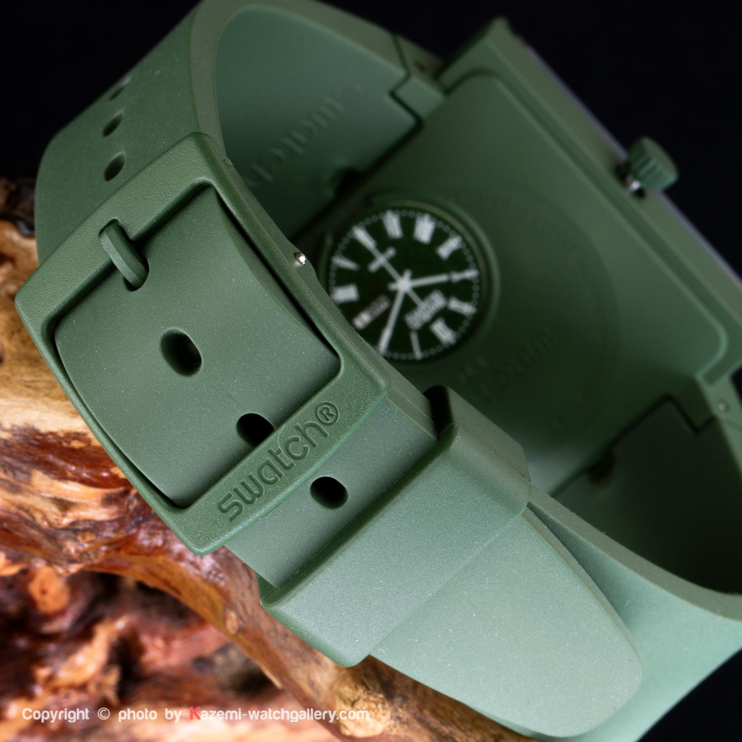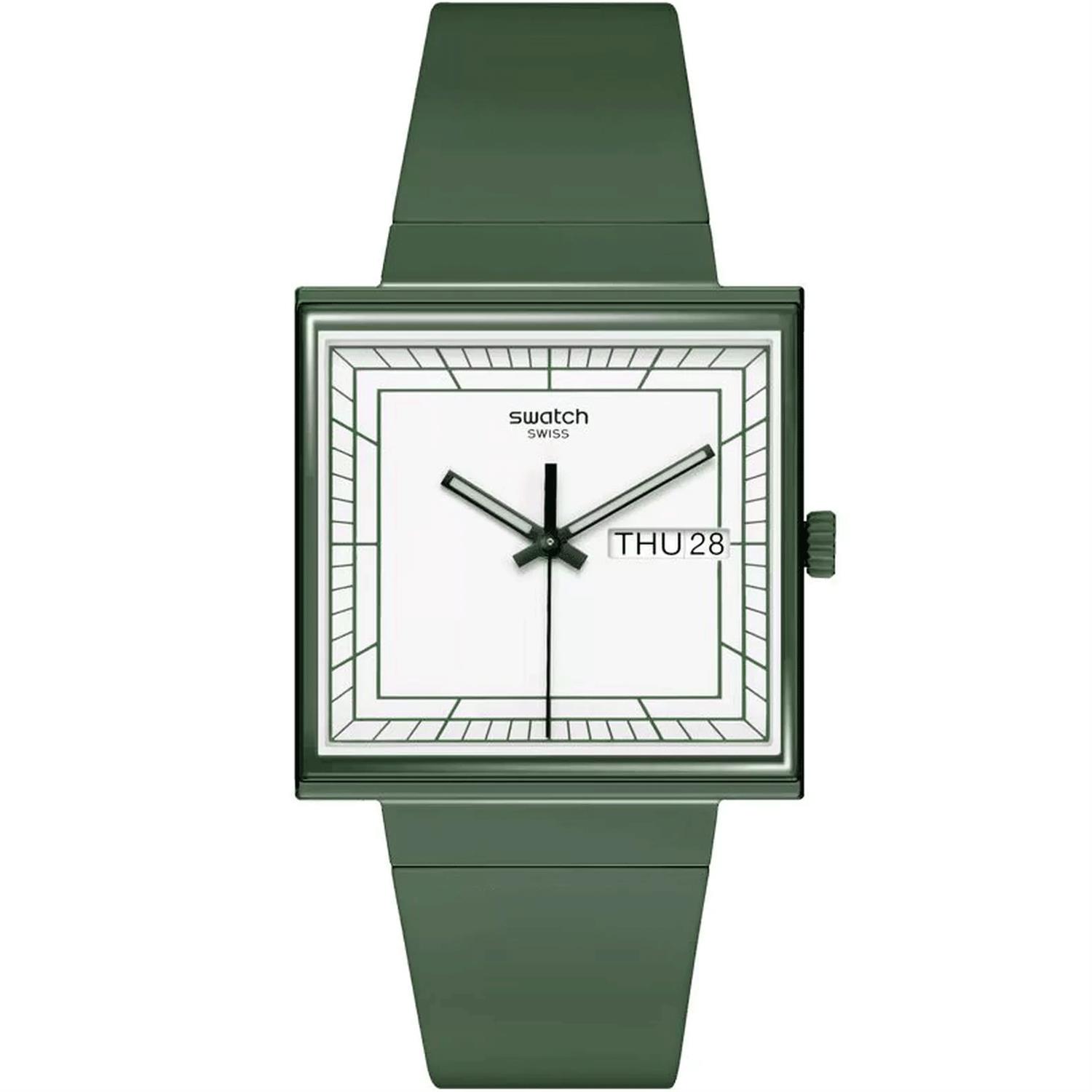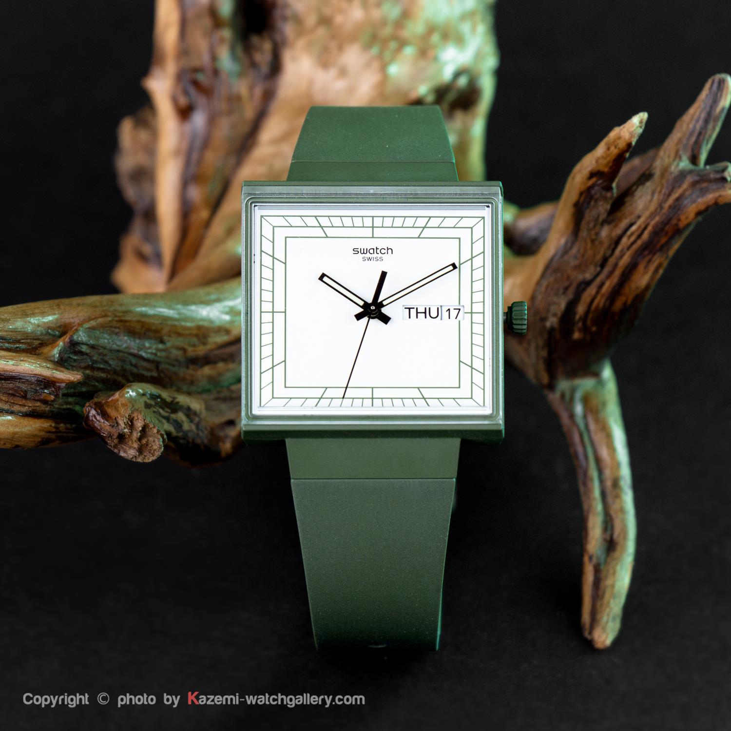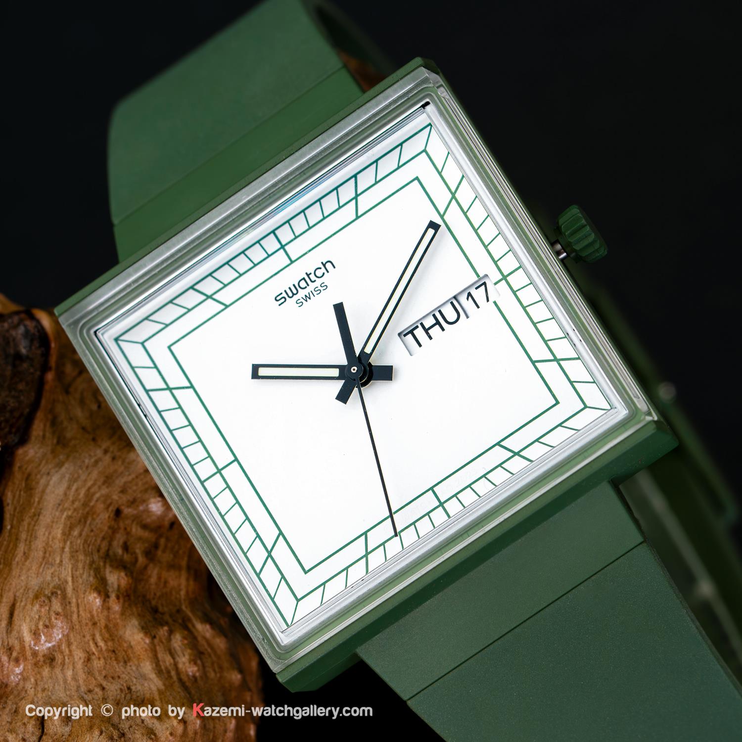 ساعت مچی مردانه/زنانه سواچ SWATCH با طراحی روزانه بند سیلیکونی سبز و قاب مربع سبز و صفحه مربع سفید با موتور سوییسی و انرژی باتری و قابلیت داشتن تقویم روزهای هفته شب نما و مقاوم در برابر آب تا عمق 30 متر به همراه دو سال گارانتی بین المللی