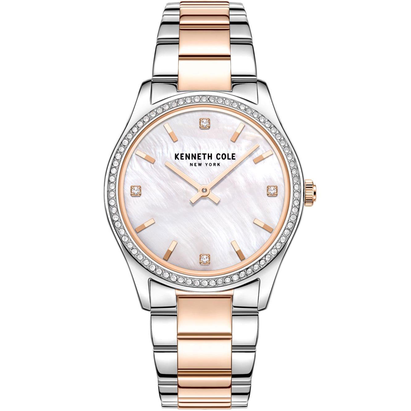 ساعت مچی زنانه کنت کول kenneth cole با طراحی روزانه بند استیل مسی , قاب فلزی دور نگین دار دورنگ و صفحه گرد نگین دار سفید صدفی و موتور ژاپنی با انرژی باتری و مقاومت در برابر آب تا عمق 30 متر به همراه دو سال گارانتی بین المللی