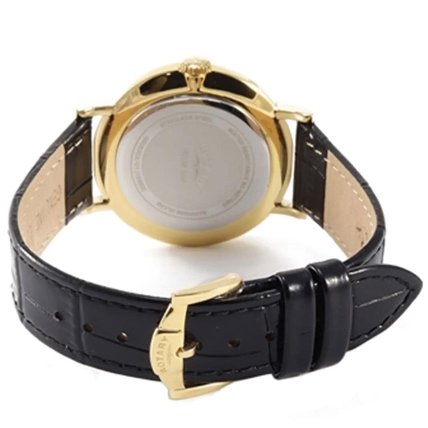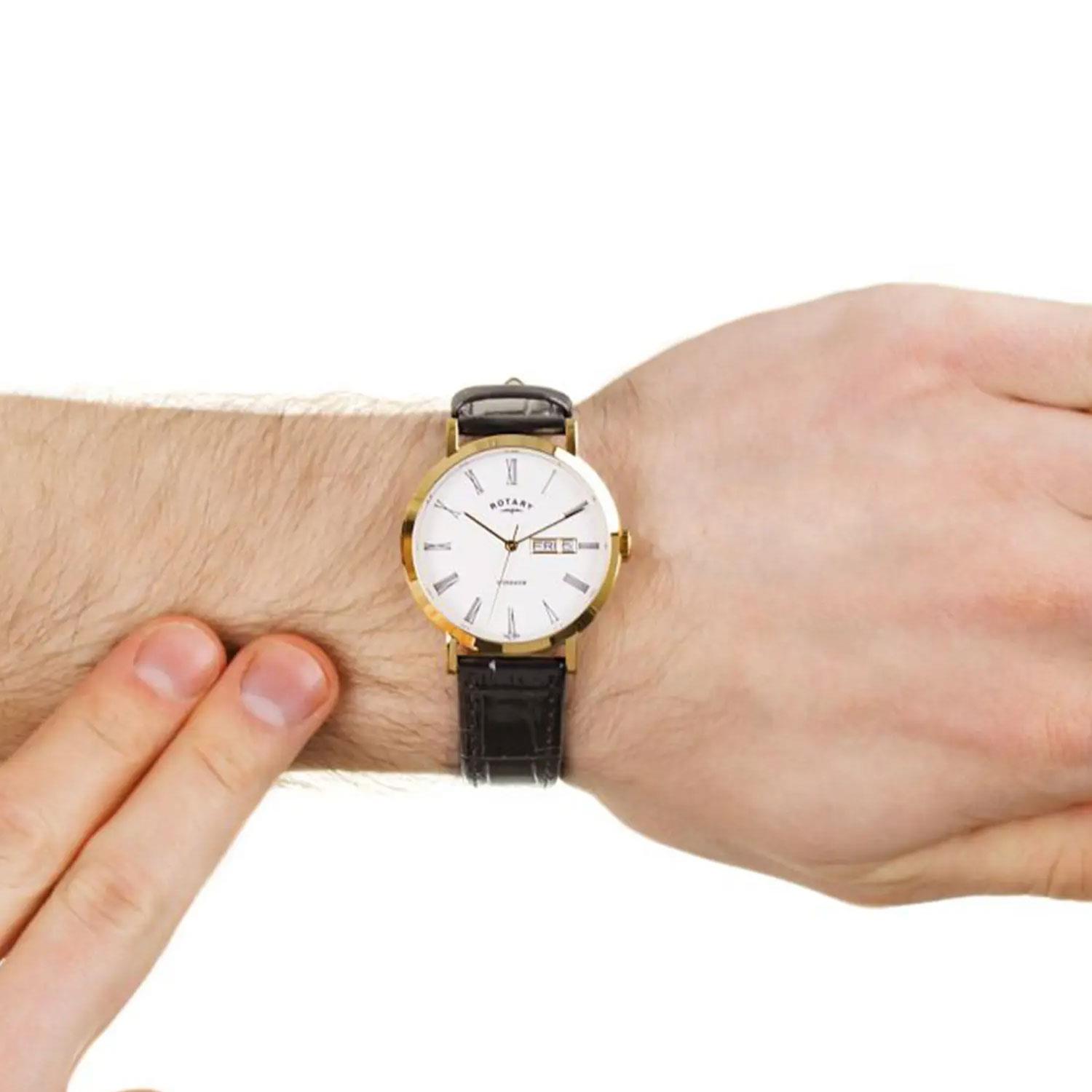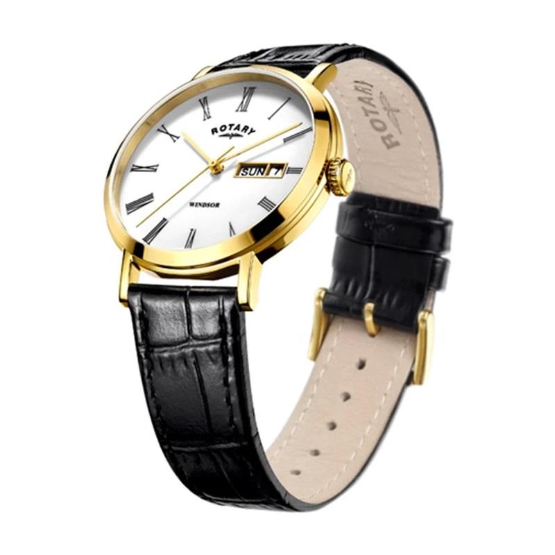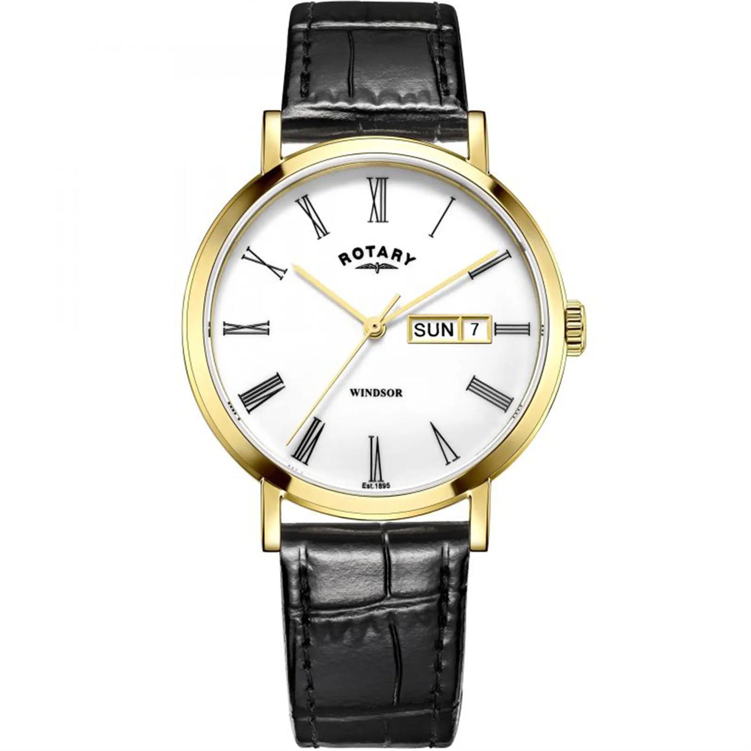 ساعت مچی مردانه روتاری rotary با طراحی کلاسیک بند چرمی با قاب گرد طلایی و صفحه  گرد سفید با شیشه ضد خراش و قابلیت داشتن تقویم / روزهای هفته و موتور ژاپنی با انرژی باتری و مقاوم در برابر آب تا عمق 50 متر به همراه گارانتی بین المللی
