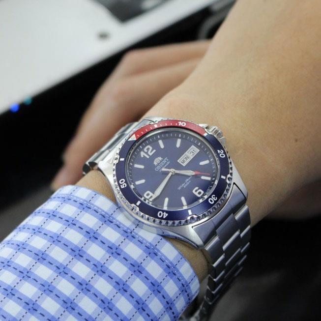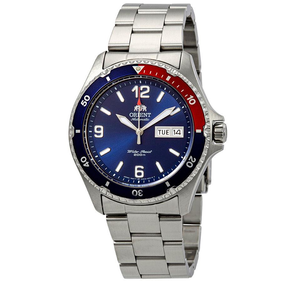 ساعت مچی مردانه اورینت orient با طراحی روزانه استیل و قاب گرد استیل قرمز و سرمه ای و صفحه گرد سرمه ای با قابلیت داشتن تقویم / روزهای هفته / شب نما / زه چرخان و موتور اتوماتیک ژاپنی با انرژی مکانیکی و مقاومت در برابر آب تا عمق 200 متر به همراه دو سال گارانتی بین المللی