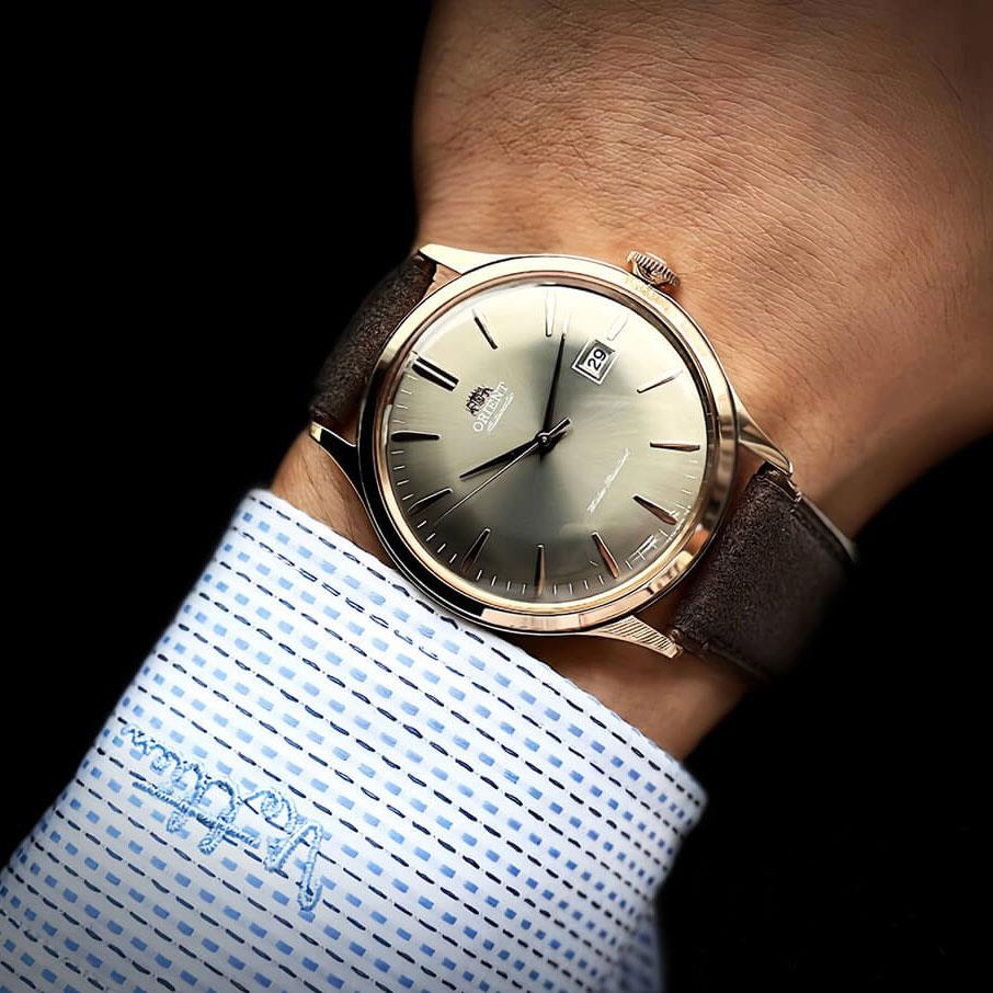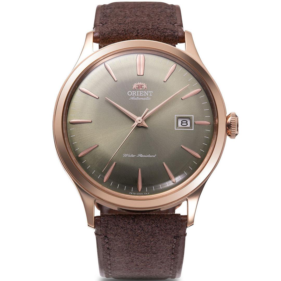 ساعت مچی مردانه اورینت orient با طراحی کلاسیک بند چرمی قهوه ای و قاب فلزی مسی و صفحه گرد طوسی و قابلیت داشتن تقویم و موتور اتوماتیک ژاپنی با انرژی مکانیکی و مقاومت در برابر آب تا عمق 30 متر به همراه دو سال گارانتی بین المللی