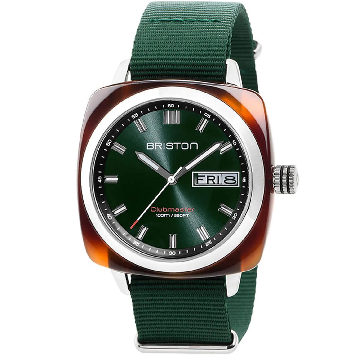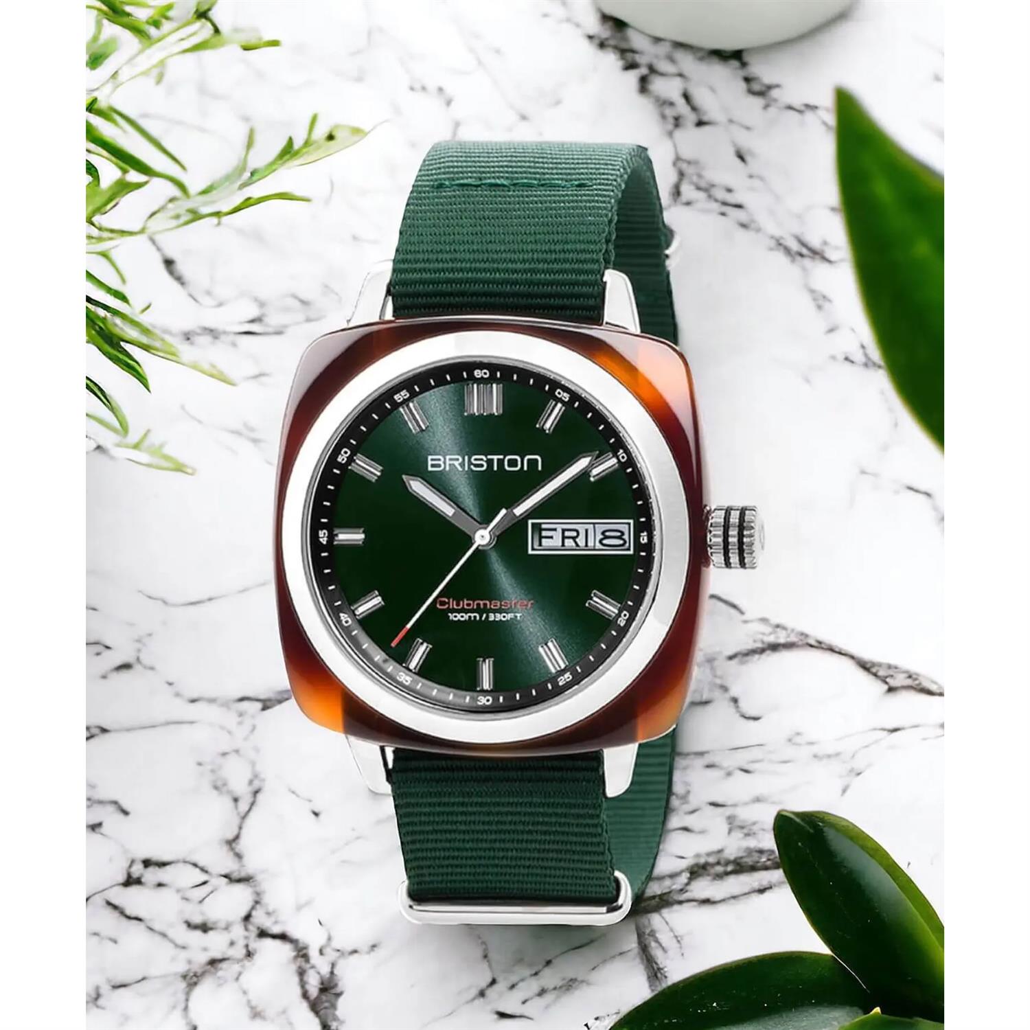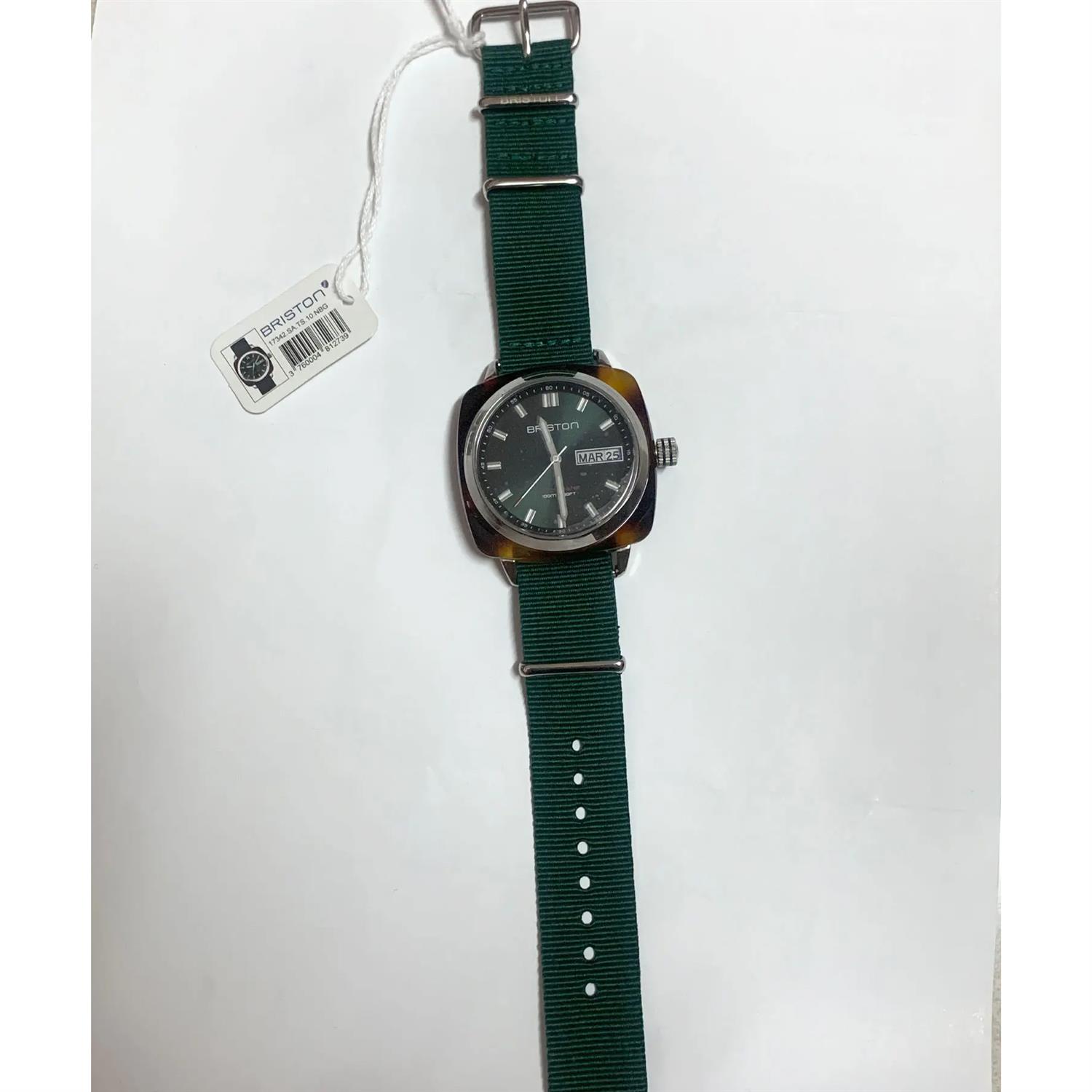 ساعت مچی مردانه بریستون briston با طراحی اسپرت بند برزنتی سبز و قاب مربع دو رنگ و صفحه گرد سبز و قابلیت داشتن تقویم/ شب نما / روزهای هفته و موتور ژاپنی با انرژی باتری و مقاوم در برابر آب تا عمق 100متر به همراه گارانتی بین المللی