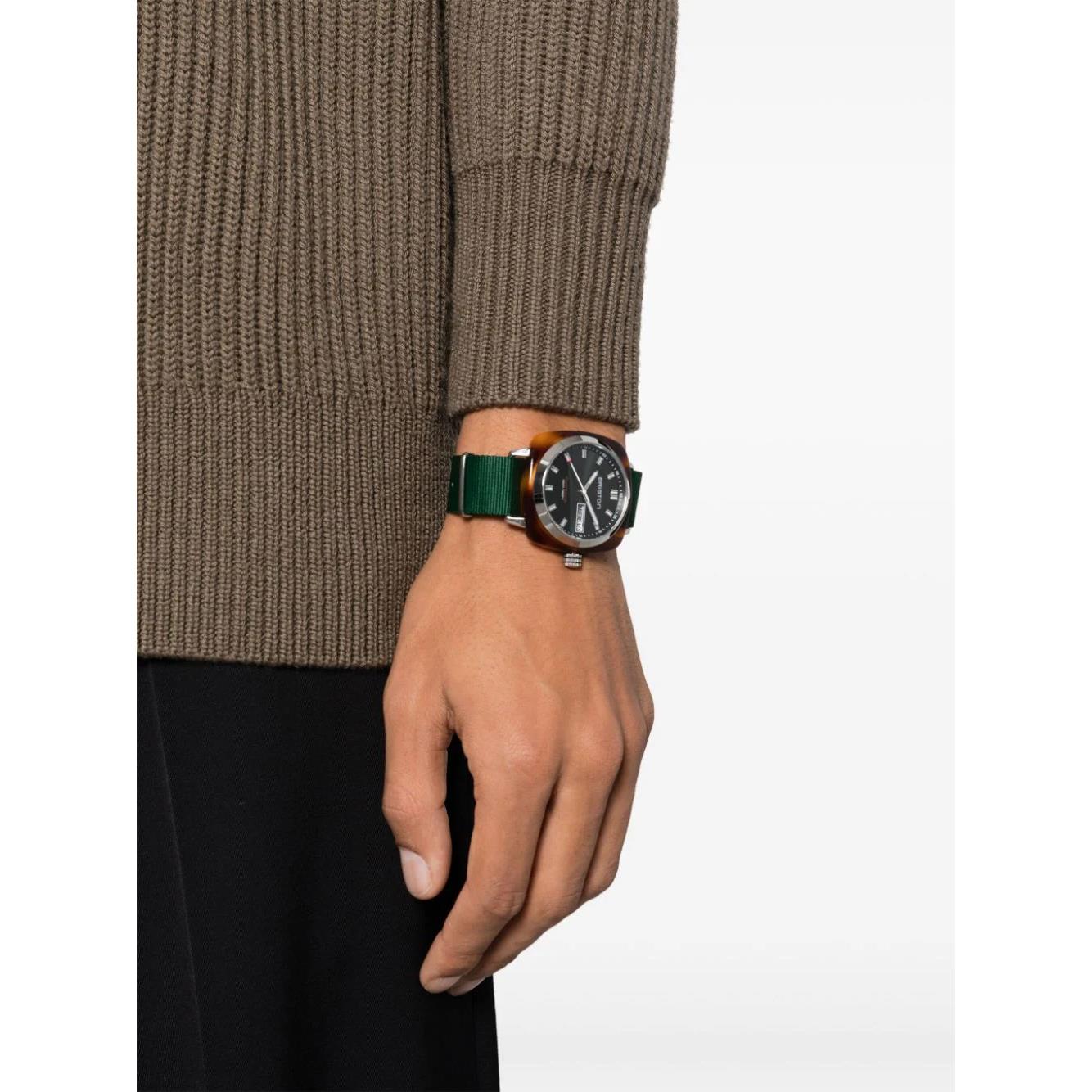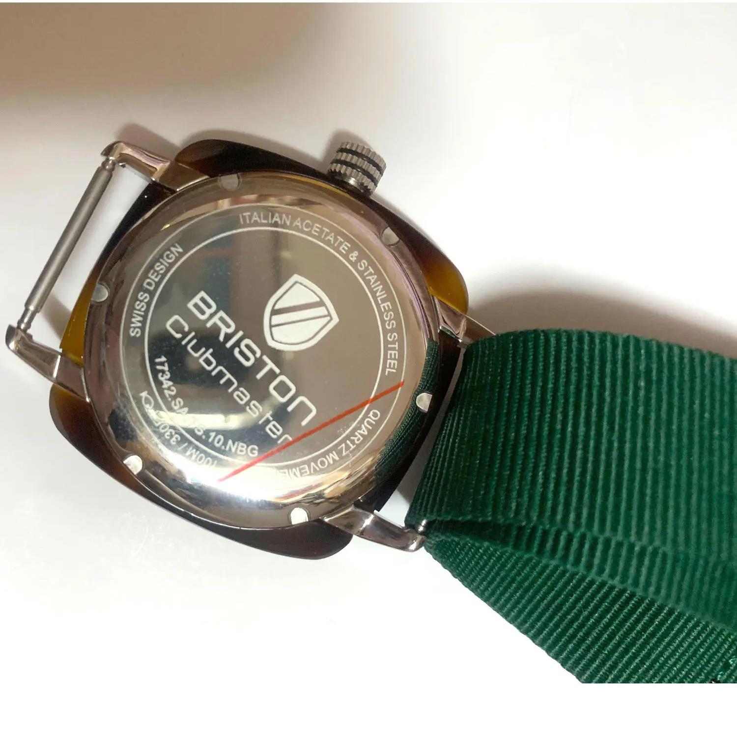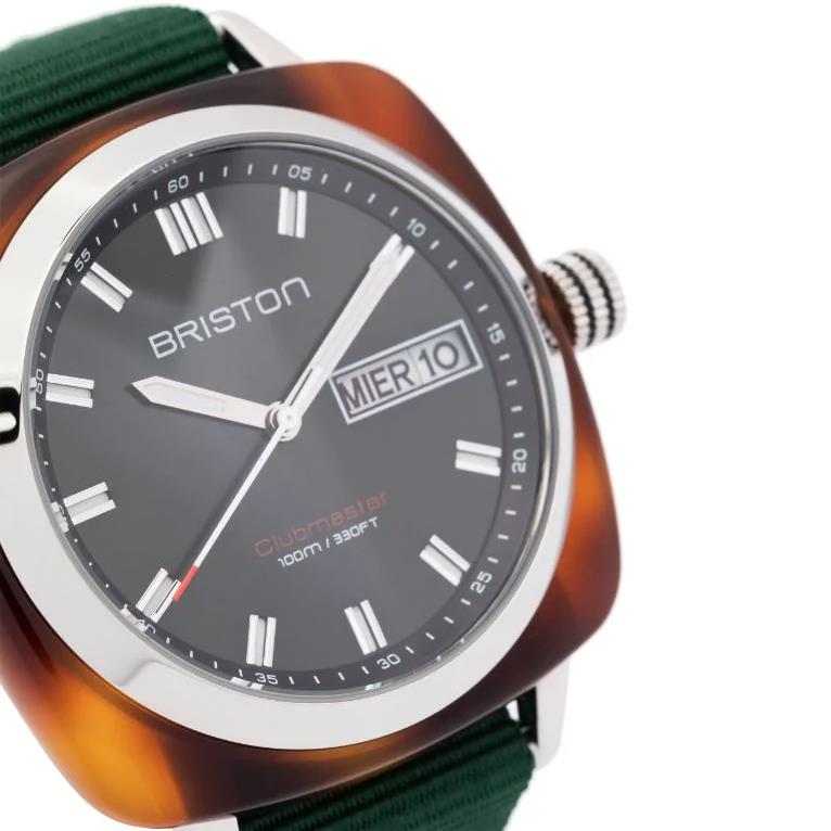 ساعت مچی مردانه بریستون briston با طراحی اسپرت بند برزنتی سبز و قاب مربع دو رنگ و صفحه گرد سبز و قابلیت داشتن تقویم/ شب نما / روزهای هفته و موتور ژاپنی با انرژی باتری و مقاوم در برابر آب تا عمق 100متر به همراه گارانتی بین المللی