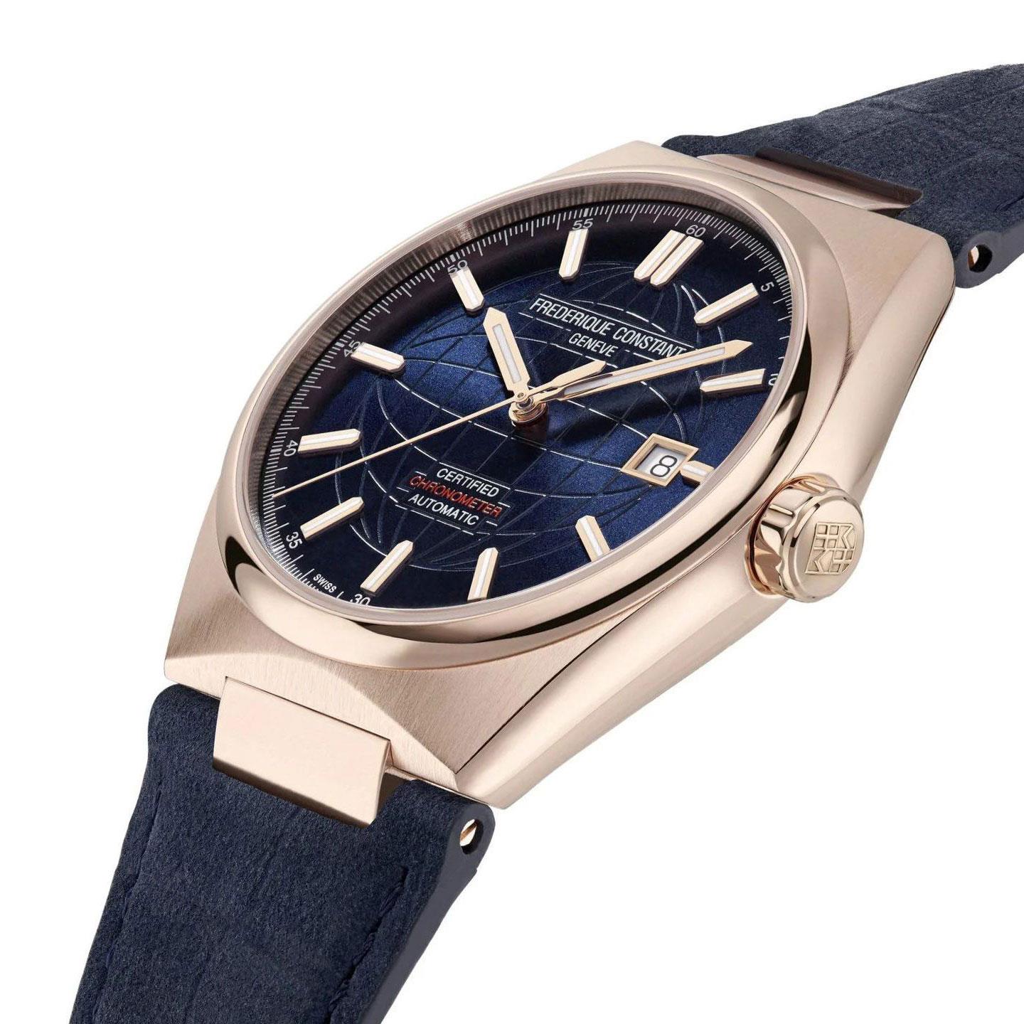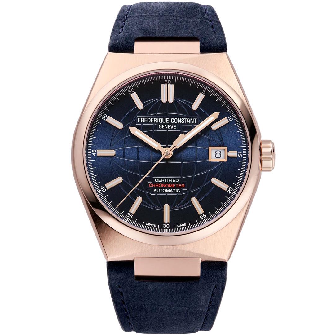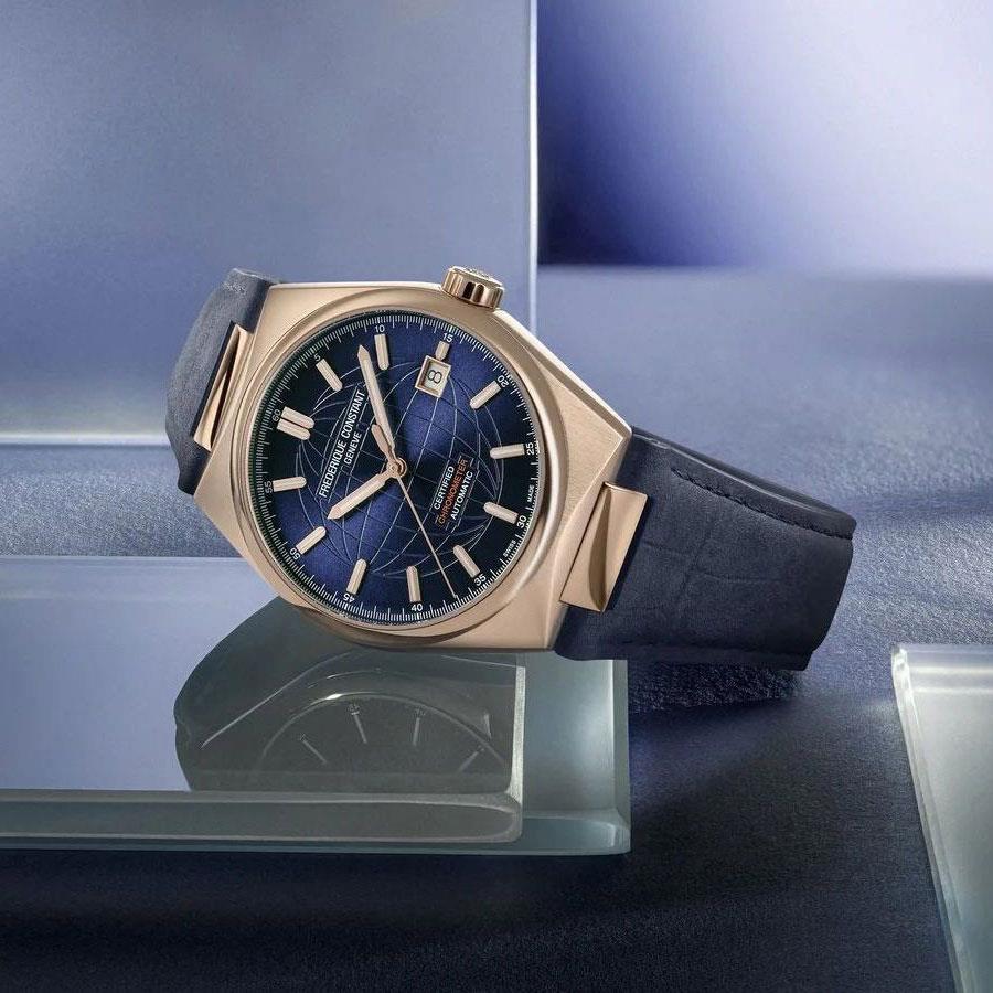 ساعت مچی مردانه FREDERIQUE CONSTANT با طراحی اسپرت بند چرمی سرمه ای با قاب فلزی مسی و صفحه گرد سرمه ای با شیشه ضد خراش وقابلیت داشتن تقویم /شب نما و موتور اتوماتیک سوییسی با انرژی مکانیکی و مقاوم در برابر آب تا عمق 100 متر به همراه دو سال گارانتی بین المللی