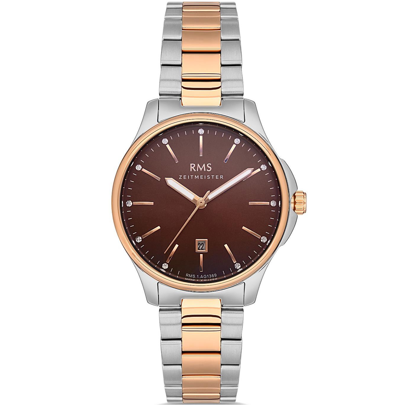 ساعت مچی زنانه آر ام اس RMS با طراحی روزانه بند استیل مسی و قاب مسی استیل و صفحه قهوه ای مزین به نگین با قابلیت داشتن تقویم / شب نما و موتور ژاپنی با انرژی باتری و مقاوم در برابر آب تا عمق 30 متر به همراه گارانتی بین المللی