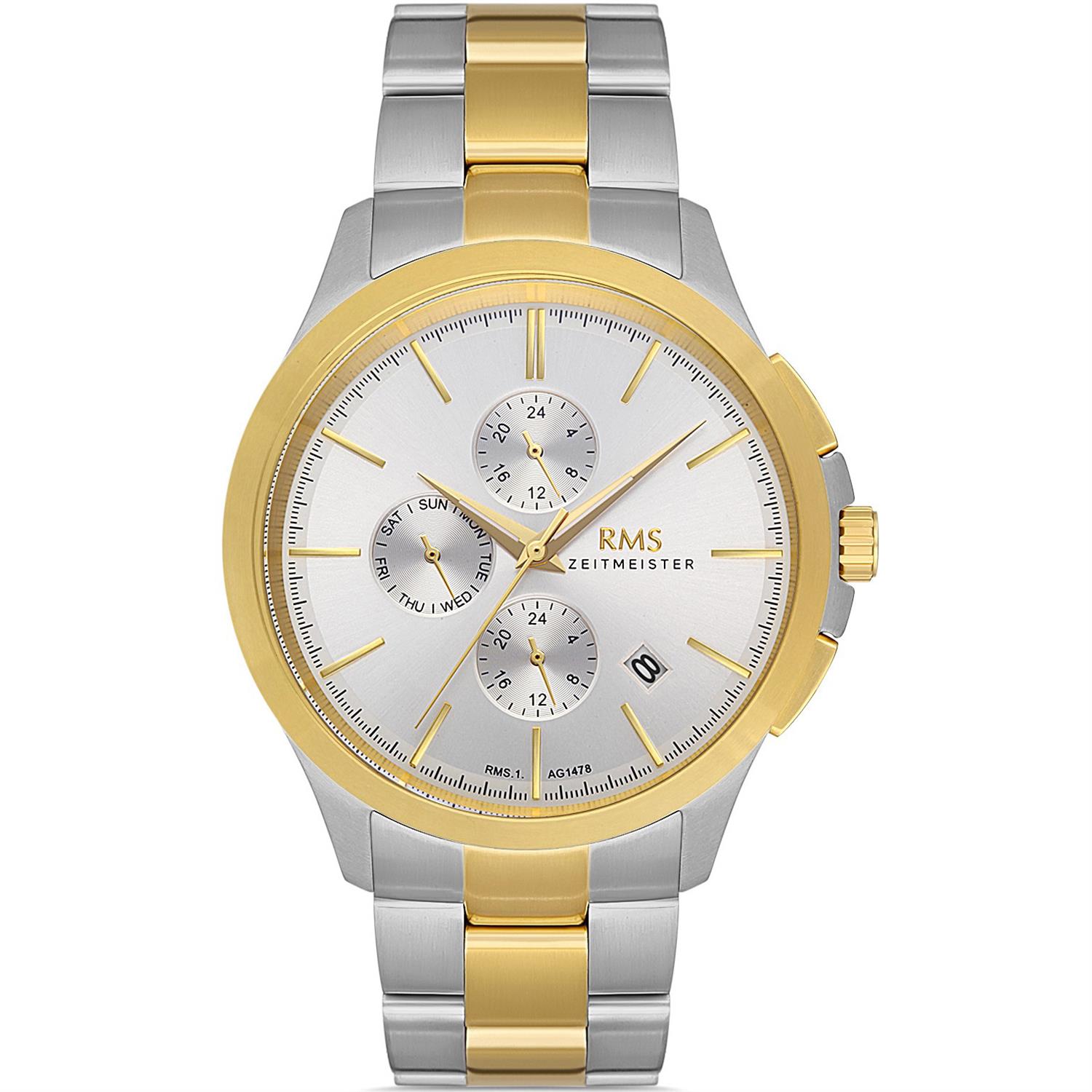 ساعت مچی مردانه  آر ام اس RMS با طراحی روزانه بند استیل طلایی و قاب طلایی استیل و صفحه گرد نقره ای با قابلیت داشتن تقویم / شب نما/ روزهای هفته/ دو زمانه و موتور ژاپنی با انرژی باتری و مقاوم در برابر آب تا عمق 30 متر به همراه گارانتی بین المللی