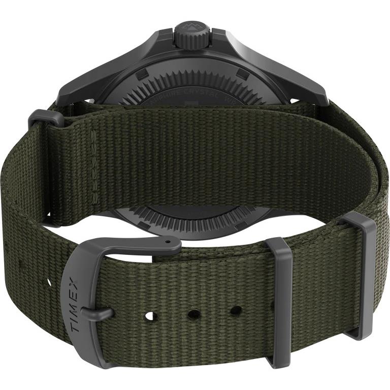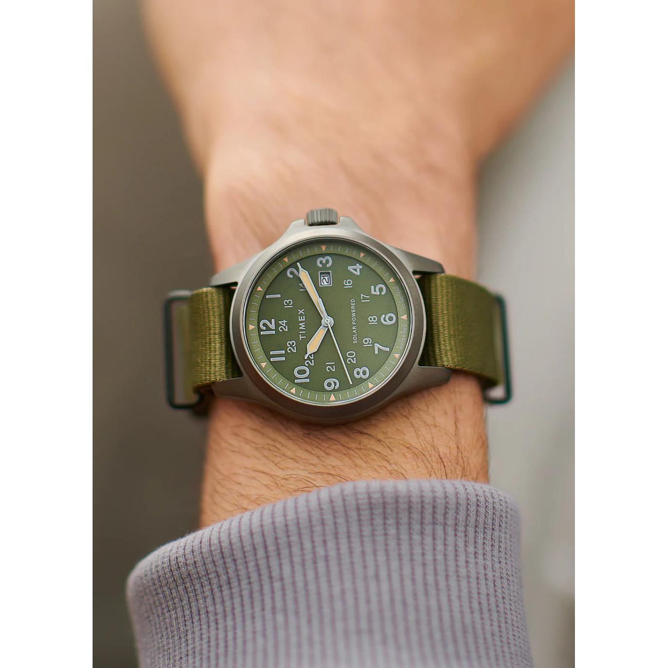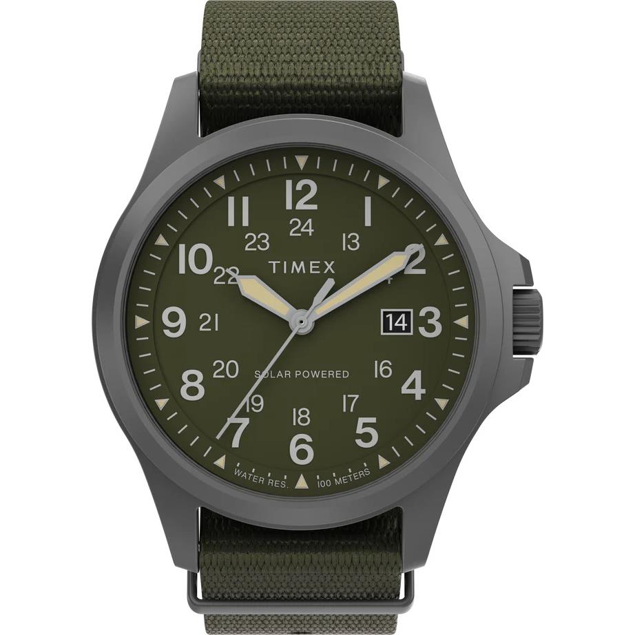 ساعت مچی مردانه تایمکس timex با طراحی اسپرت بند برزنتی سبز و قاب استیل با صفحه گرد سبز و شیشه ضد خراش و قابلیت داشتن شب نما / تقویم و موتور ژاپنی با انرژی خورشیدی و مقاوم در برابر آب تا عمق 100 متر به همراه گارانتی بین المللی