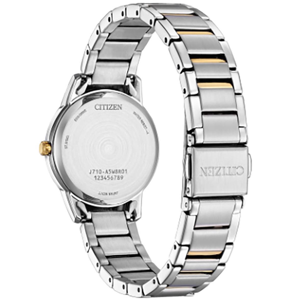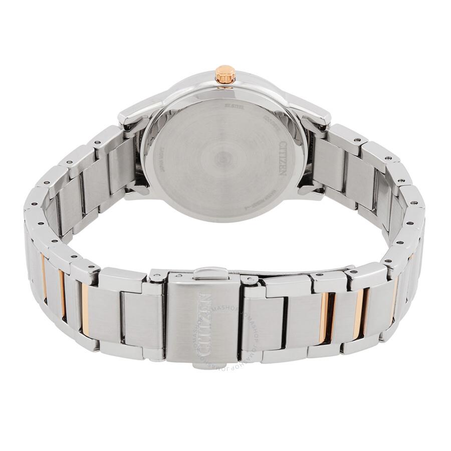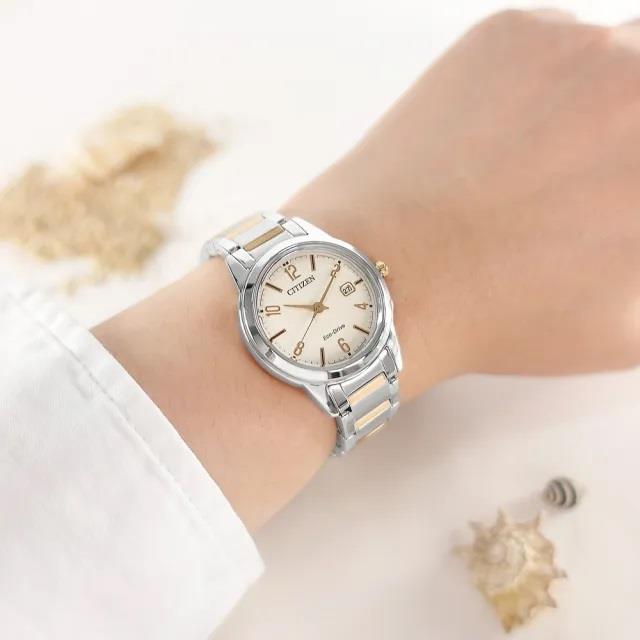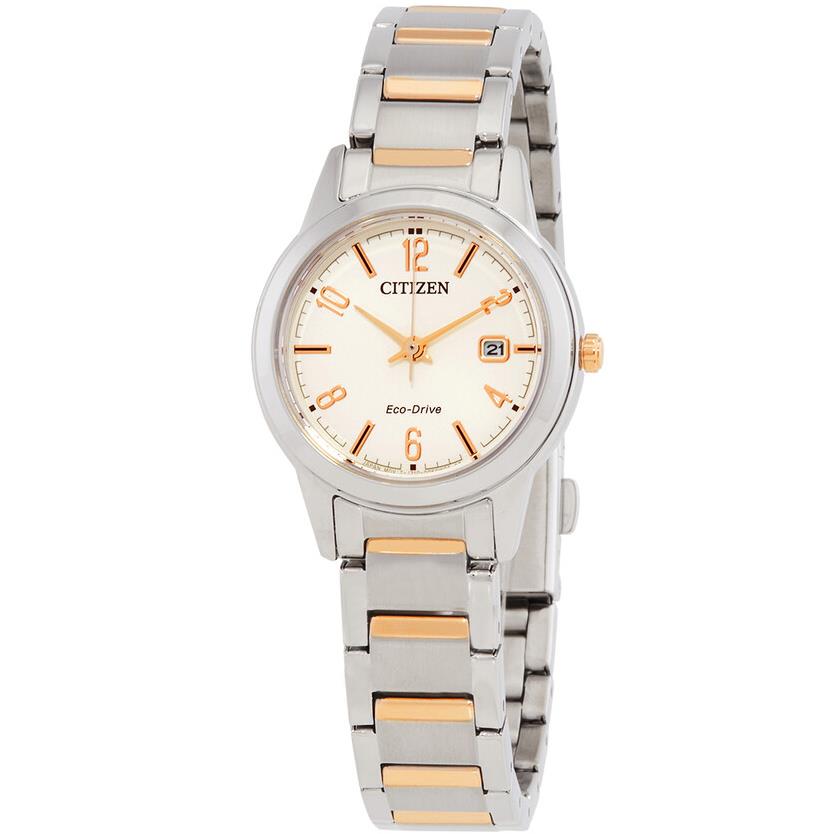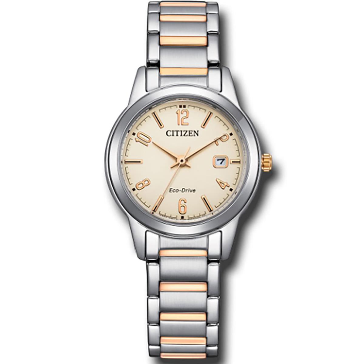 ساعت مچی زنانه سیتیزن citizen با طراحی روزانه بند مسی استیل و قاب گرد استیل و صفحه گرد کرم و قابلیت داشتن تقویم و موتور اکودرایو ژاپنی  و مقاومت در برابر آب تا عمق 30 متر به همراه سه سال گارانتی بین المللی