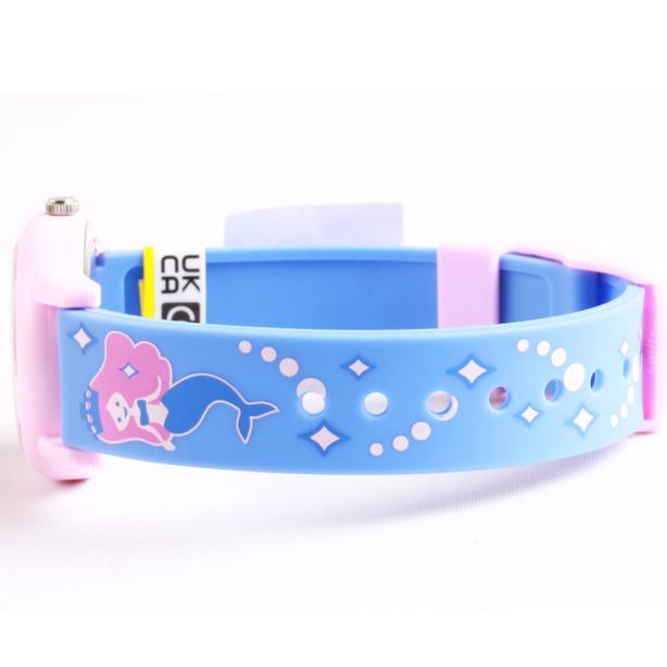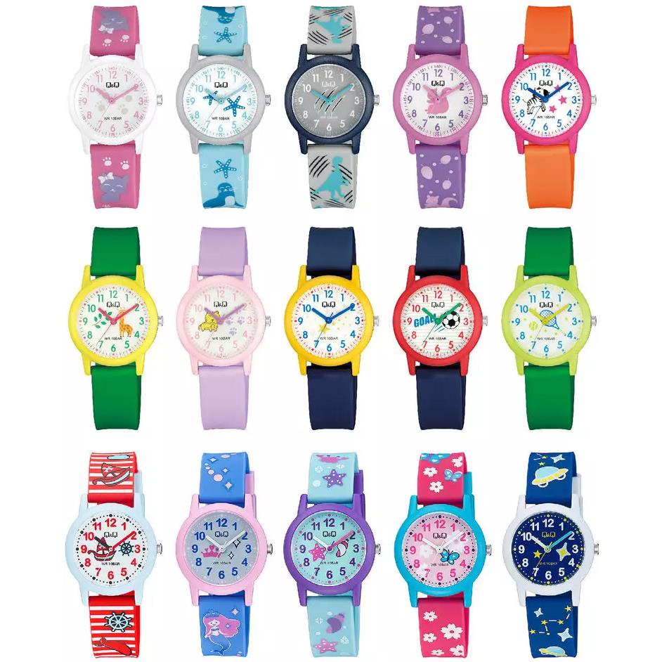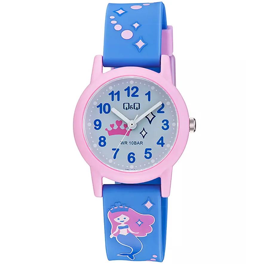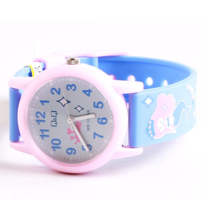 ساعت مچی دخترانه کیو اند کیو QQ با طراحی روزانه بند سیلیکونی آبی و قاب گرد صورتی و صفحه گرد طوسی و موتور ژاپنی با انرژی باطری و مقاوم در برابر آب تا عمق 100 متر به همراه یک سال گارانتی شرکتی