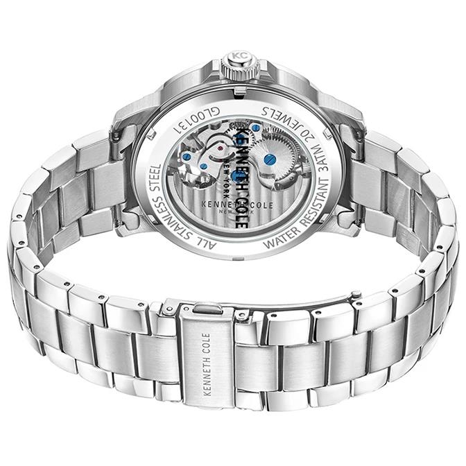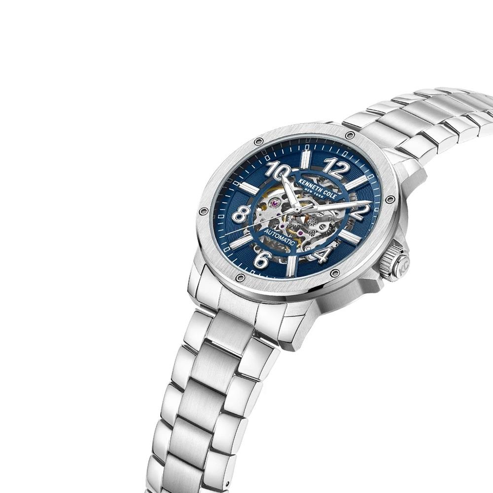 ساعت مچی مردانه کنت کول kenneth cole  با طراحی اسپرت بند استیل و قاب استیل و صفحه اسکلتون سرمه ای  و قابلیت داشتن شب نما و موتوراتوماتیک ژاپنی با انرژی مکانیکی و مقاومت در برابر آب تا عمق 30 متر به همراه دو سال گارانتی بین المللی