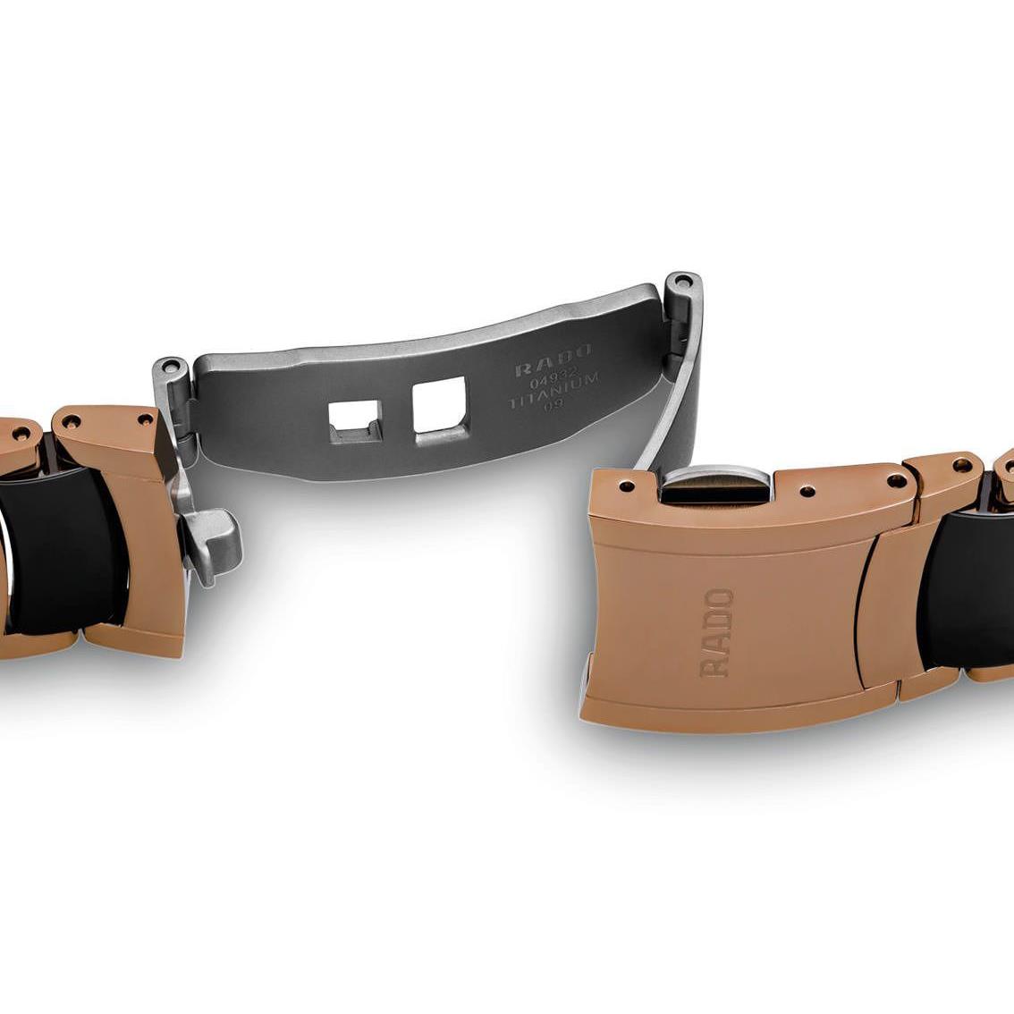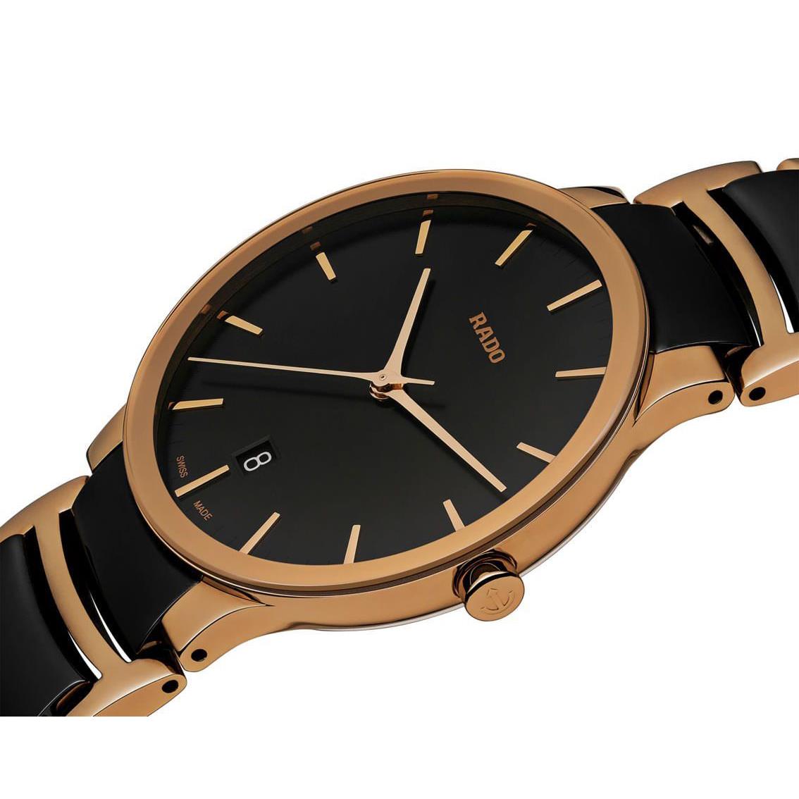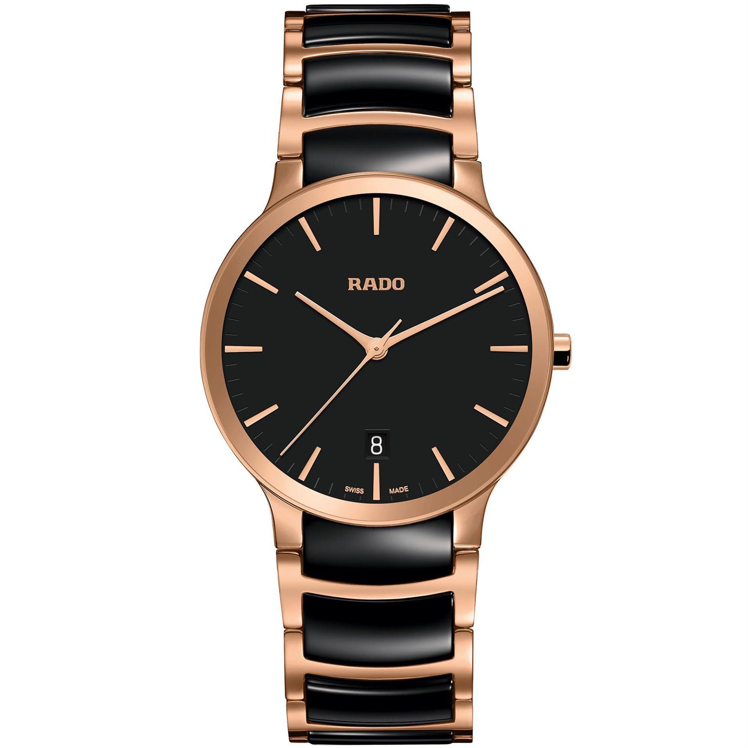 ساعت مچی مردانه رادو RADO با طراحی کلاسیک بند استیل سرامیک با قفل کلیپسی و قاب گرد مسی و صفحه گرد مشکی با شیشه ضد خراش و قابلیت داشتن تقویم و موتور سوییسی با انرژی باتری و مقاوم در برابر آب تا عمق 30 متر به همراه گارانتی بین المللی