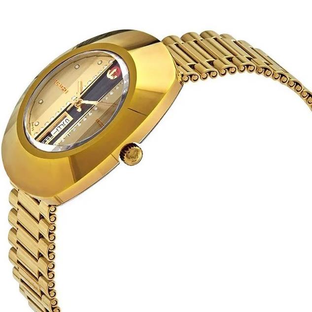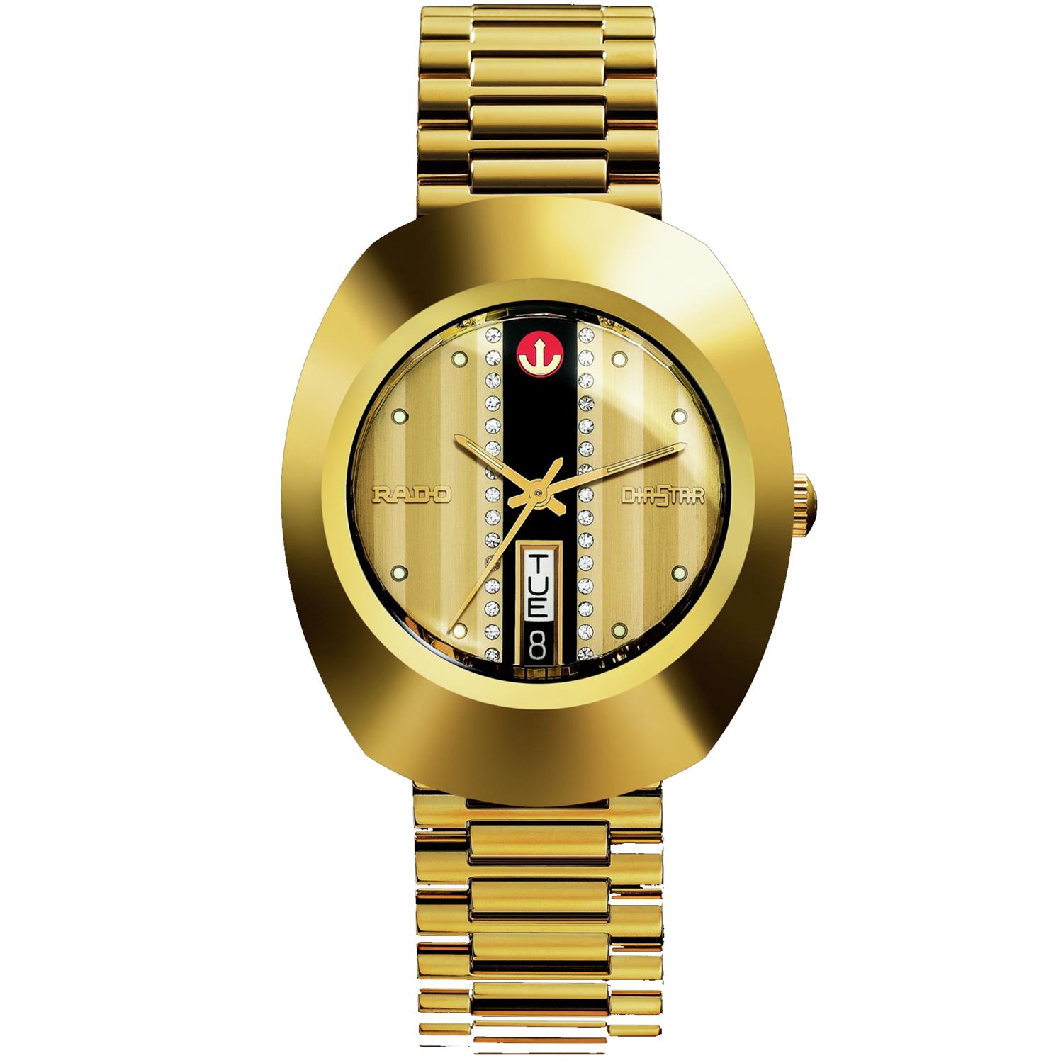 ساعت مچی مردانه رادو RADO با طراحی کلاسیک بند فلزی طلایی با قفل کلیپسی و قاب متفاوت طلایی و صفحه گرد طلایی مشکی مزین به نگین با شیشه ضد خراش و قابلیت داشتن تقویم/ روزهای هفته / شب نما و موتور اتوماتیک سوییسی با انرژی مکانیکی و مقاوم در برابر آب تا عمق 30 متر به همراه گارانتی بین المللی