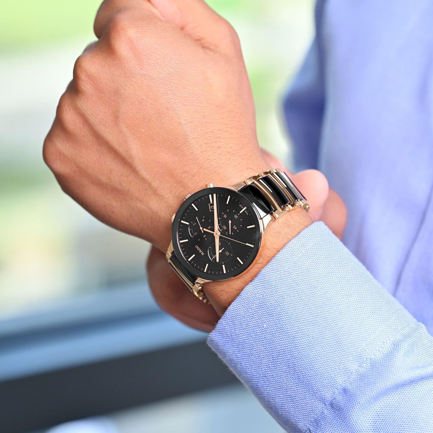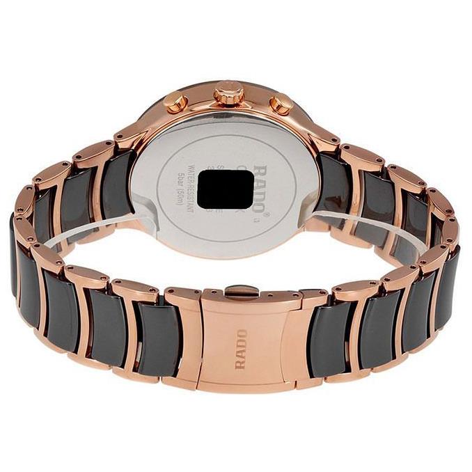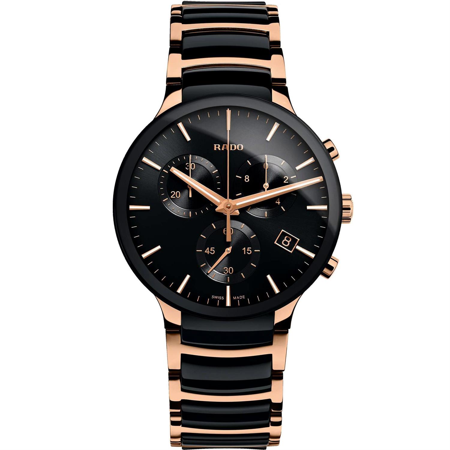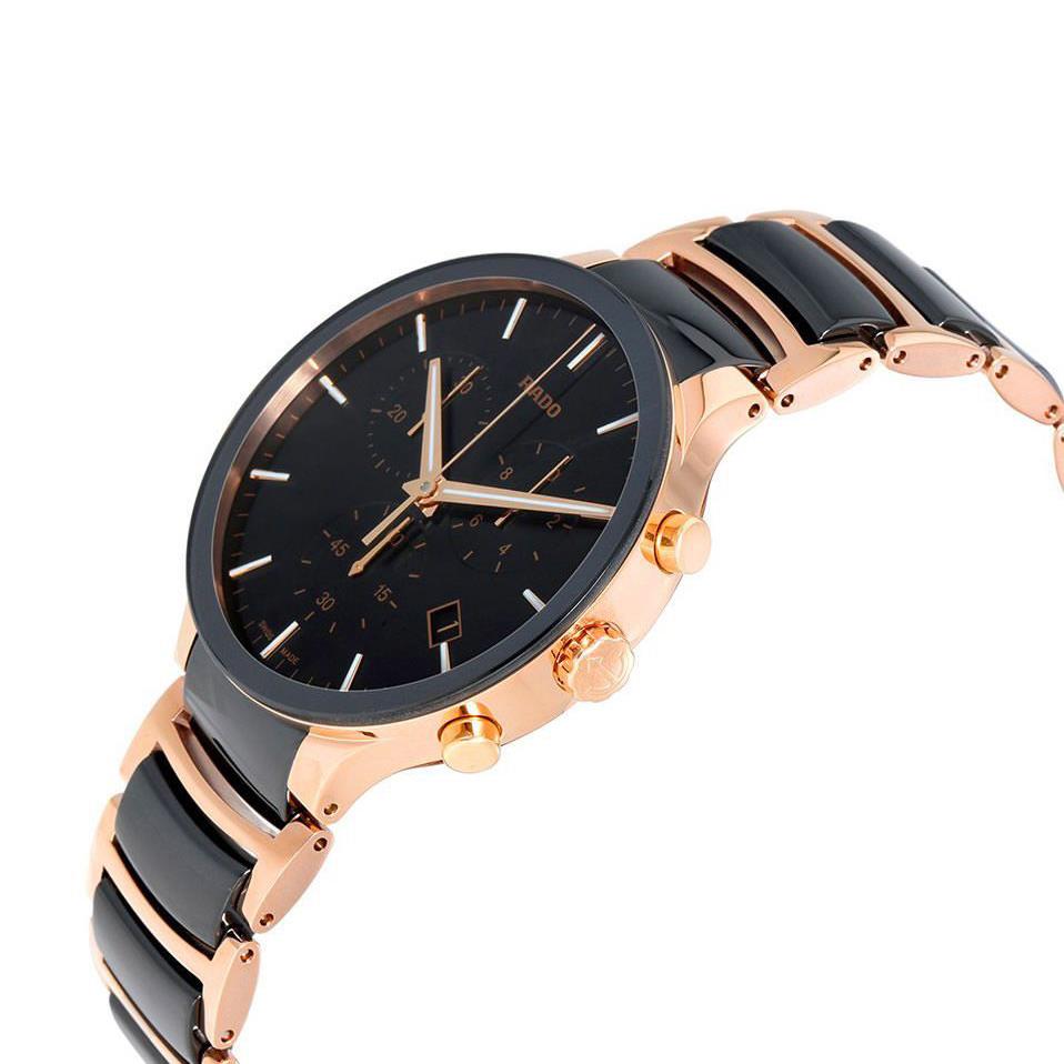 ساعت مچی مردانه رادو RADO با طراحی کلاسیک بند استیل سرامیک با قفل کلیپسی و قاب گرد مشکی مسی و صفحه مشکی با شیشه ضد خراش و قابلیت داشتن تقویم/ کرنوگراف/ شب نما و موتور سوییسی با انرژی باتری و مقاوم در برابر آب تا عمق 50 متر به همراه گارانتی بین المللی