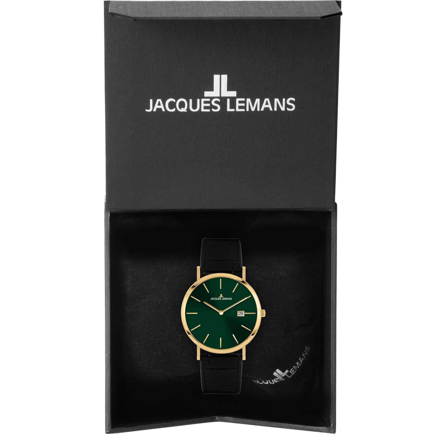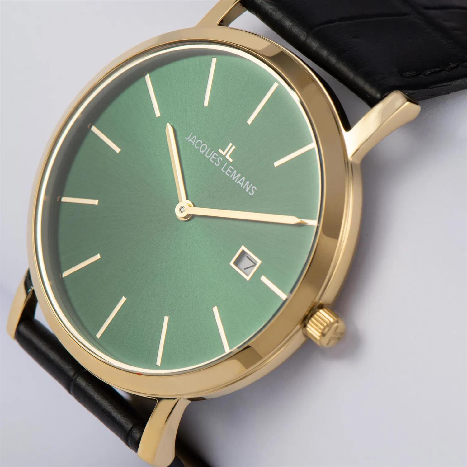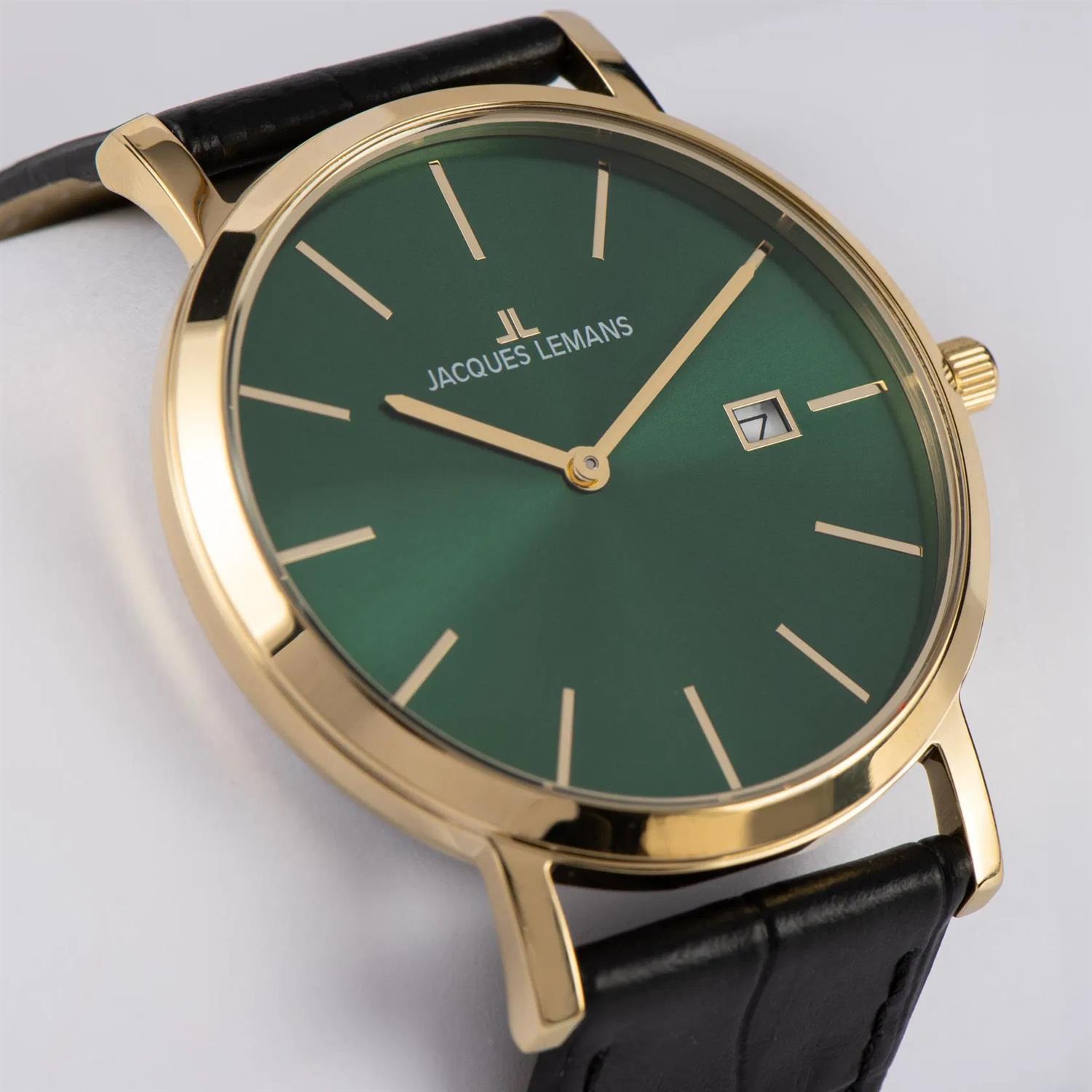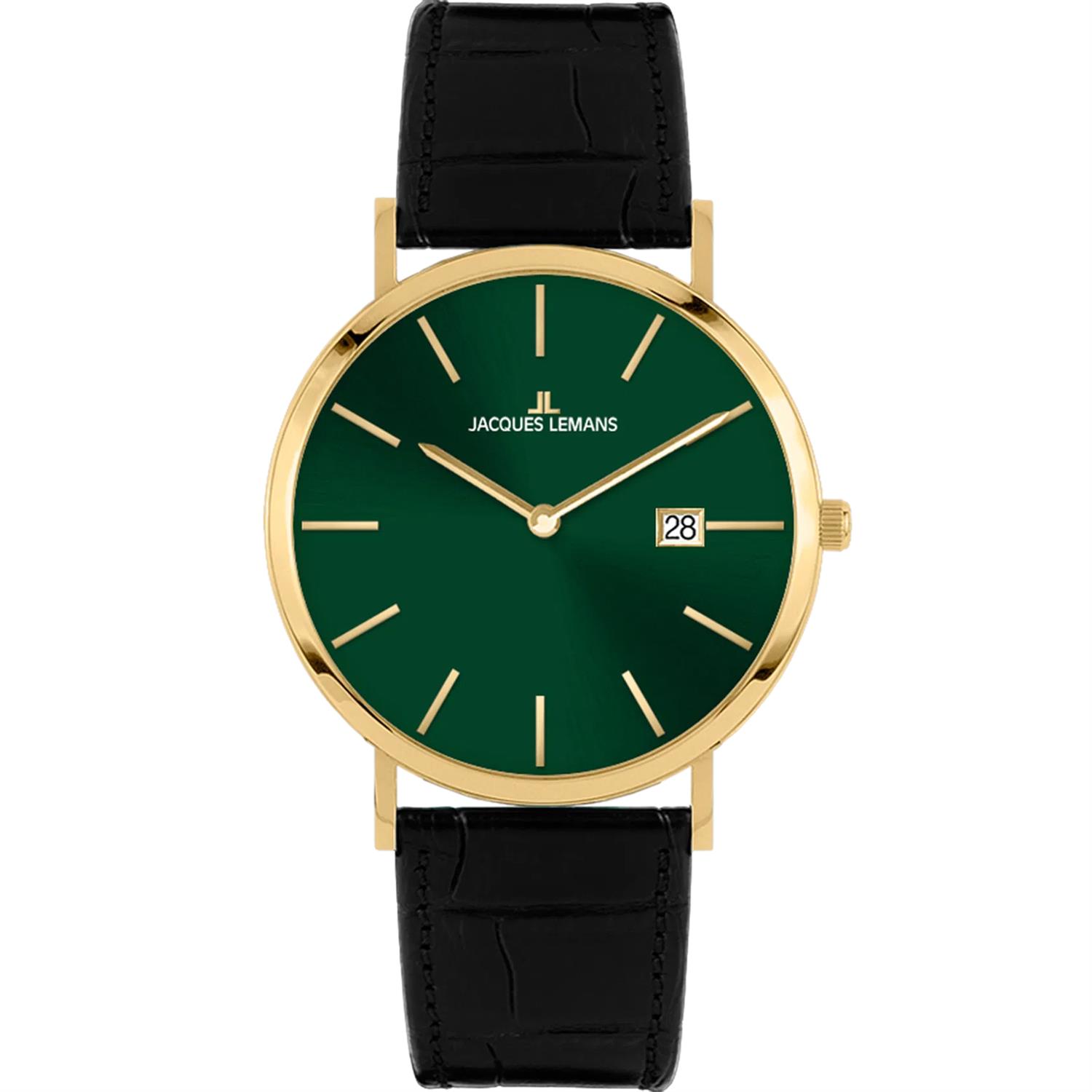 ساعت مچی مردانه ژاک لمن jacques lemans با طراحی روزانه بند چرمی و قاب فلزی طلایی و صفحه گرد سبز و قابلیت داشتن تقویم با موتور ژاپنی و انرژی باتری و مقاومت در برابر آب تا عمق 50 متر به همراه گارانتی بین المللی