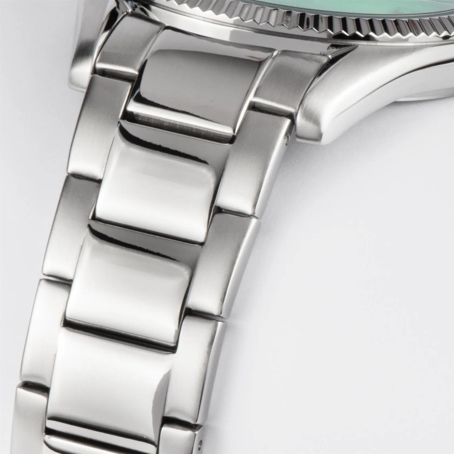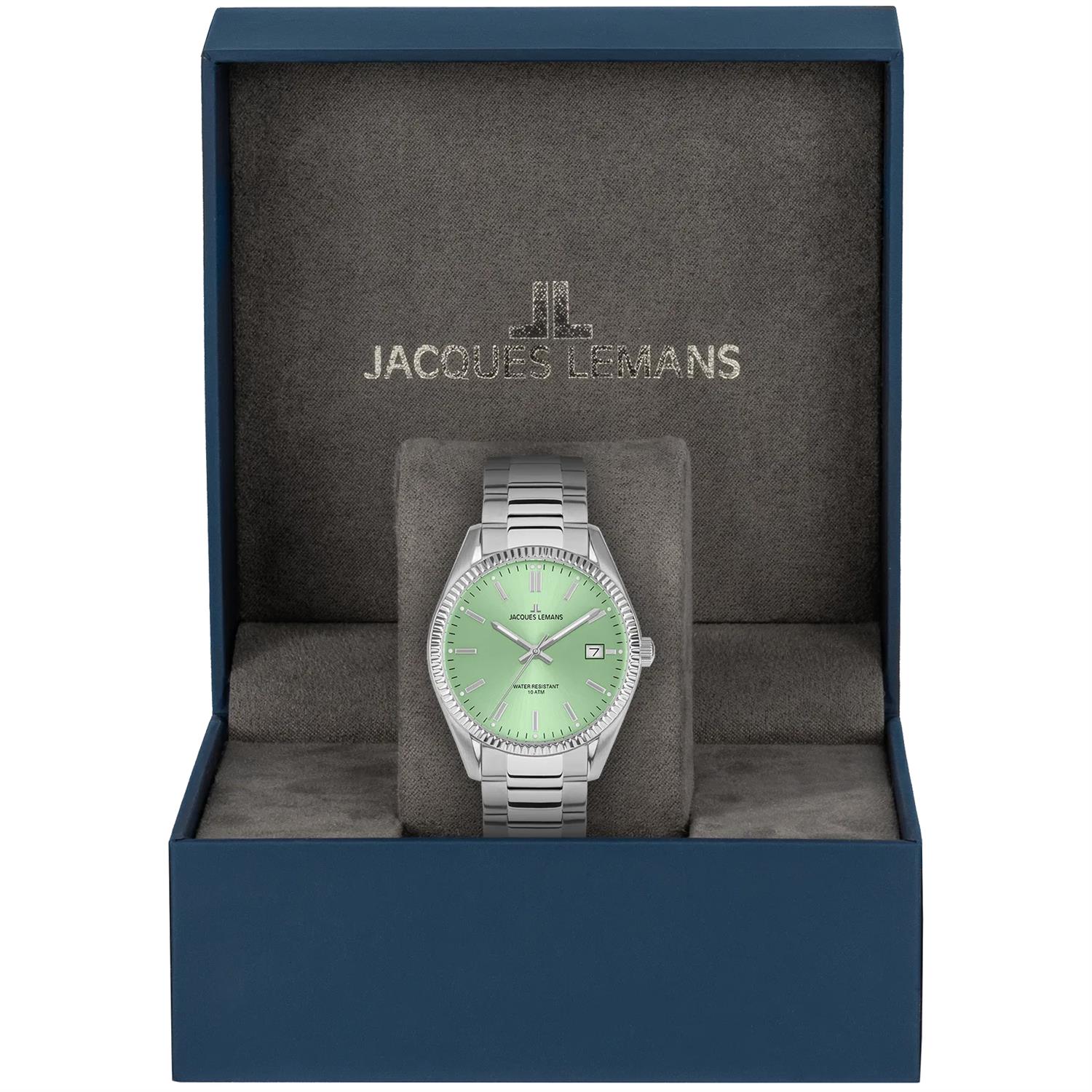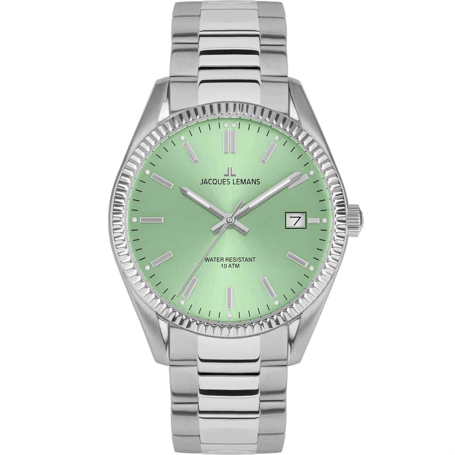 ساعت مچی زنانه  ژاک لمن jacques lemans با طراحی روزانه بند استیل و قاب استیل و صفحه گرد سبز با قابلیت داشتن تقویم , شب نما با موتور ژاپنی و انرژی باتری و مقاومت در برابر آب تا عمق 100 متر به همراه گارانتی بین المللی