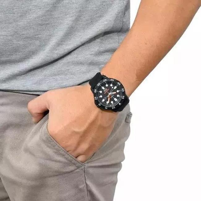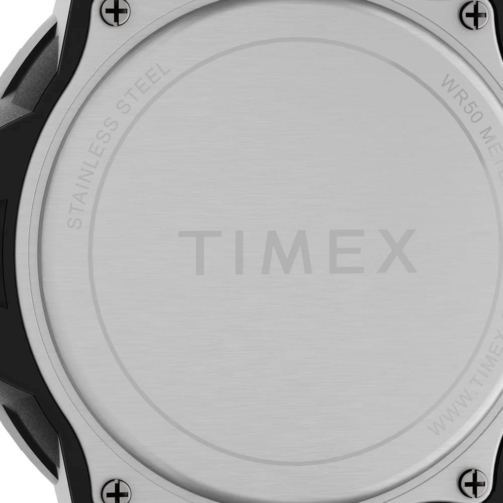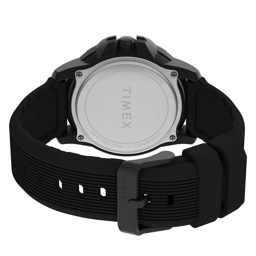 ساعت مچی مردانه تایمکس timex با طراحی اسپرت بند سیلیکونی و قاب گرد مشکی با صفحه گرد مشکی و قابلیت داشتن شب نما / تقویم و موتور ژاپنی با انرژی باطری و مقاوم در برابر آب تا عمق 50 متر به همراه گارانتی بین المللی