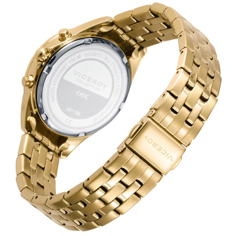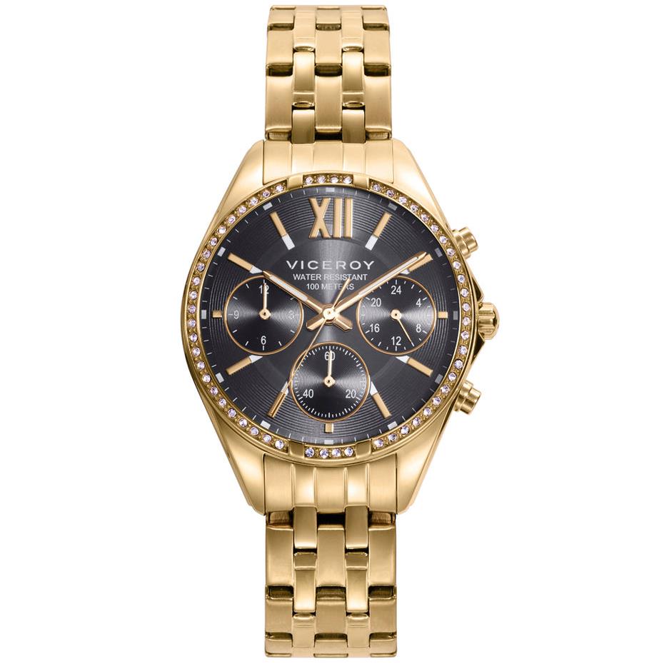 ساعت مچی زنانه ویسروی با طراحی روزانه بند فلزی طلایی با قاب دور نگین طلایی و صفحه مشکی با قابلیت داشتن روز و شب /کرنوگراف /شب نما و موتور ژاپنی و انرژی باطری و مقاوم در برابر آب تا عمق 100 متر به همراه سال گارانتی بین المللی