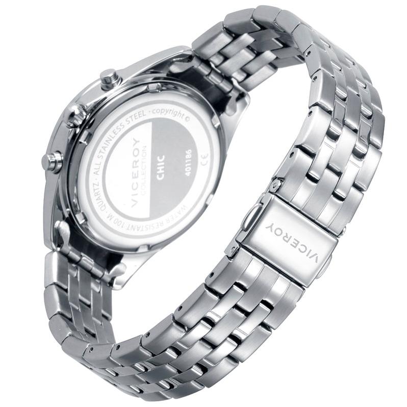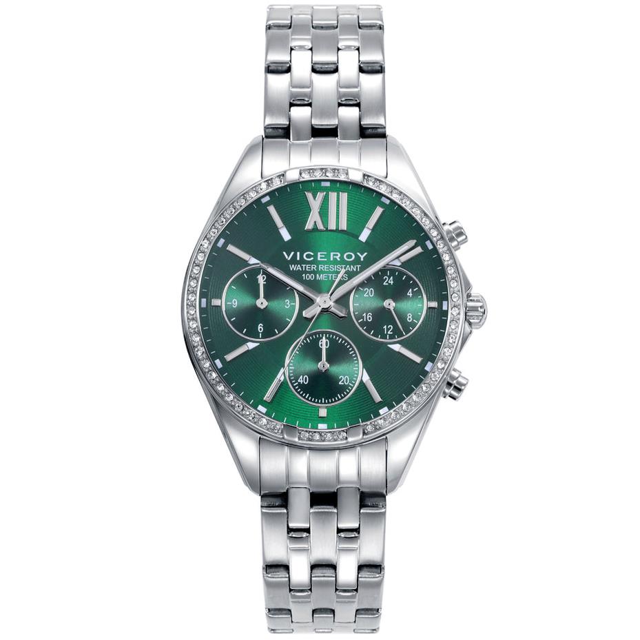 ساعت مچی زنانه ویسروی با طراحی روزانه بند استیل با قاب دور نگین استیل و صفحه گرد سبز با قابلیت داشتن روز و  شب /کرنوگراف /شب نما و موتور ژاپنی و انرژی باطری و مقاوم در برابر آب تا عمق 100 متر به همراه سال گارانتی بین المللی