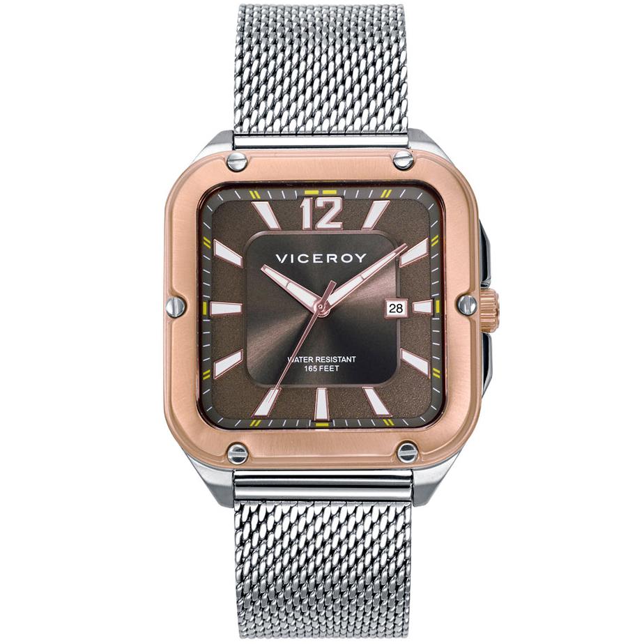 ساعت مچی مردانه ویسروی با طراحی روزانه بند حصیر بافت استیل با قاب مربع استیل مسی و صفحه مربع قهوه ای با موتور ژاپنی و انرژی باطری و قابلیت داشتن تقویم/ شب نما و مقاوم در برابر آب تا عمق 50 متر به همراه سال گارانتی بین المللی